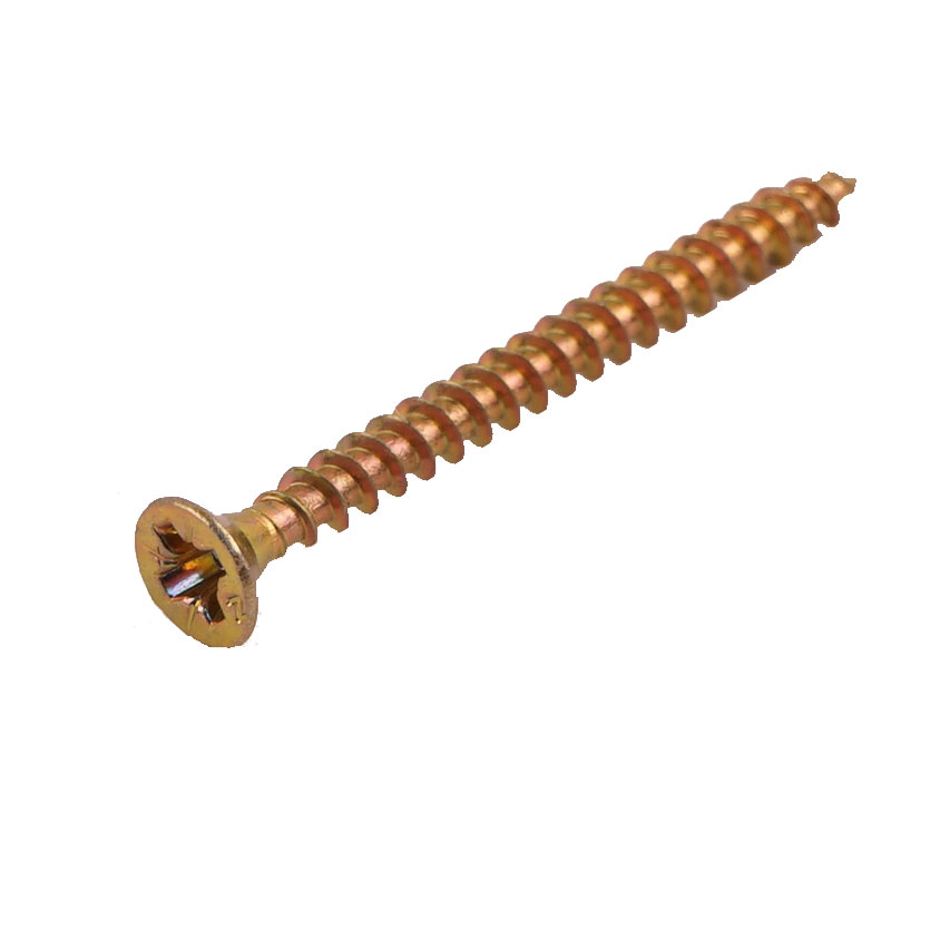 Саморез ШУж 3,5х40мм имеет потайную головку, крестообразный шлиц, острый наконечник и крупную резьбу. Выполнен из углеродистой стали, покрытие – желтый цинк.
