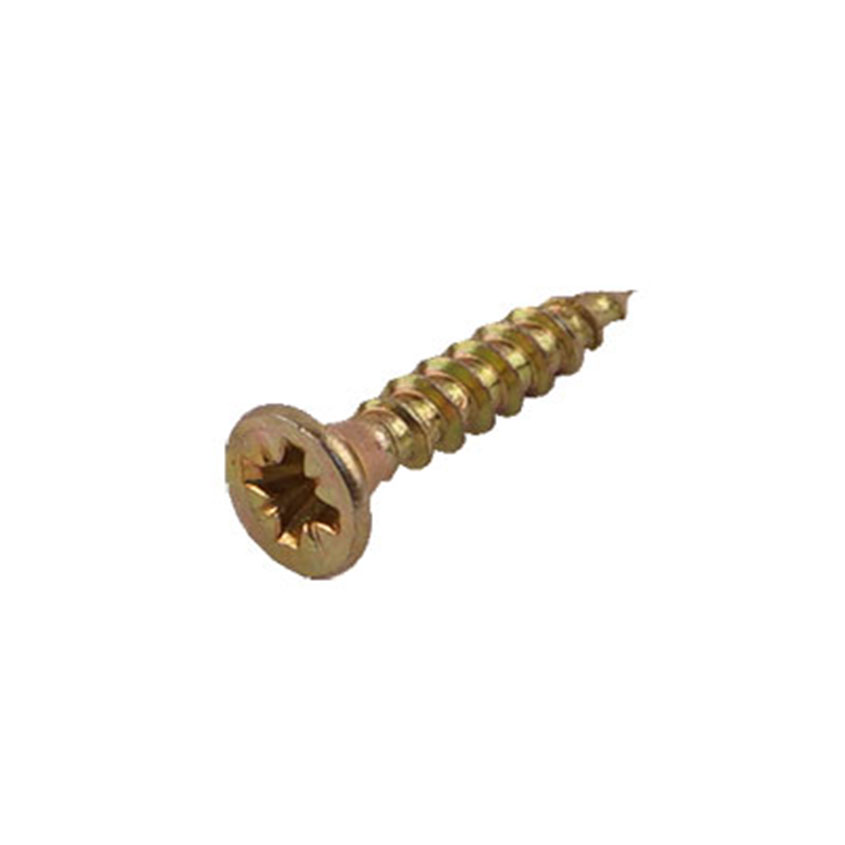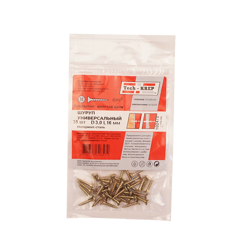 Саморез ШУж 3,0х16мм имеет потайную головку, крестообразный шлиц, острый наконечник и крупную резьбу. Выполнен из углеродистой стали, покрытие – желтый цинк.