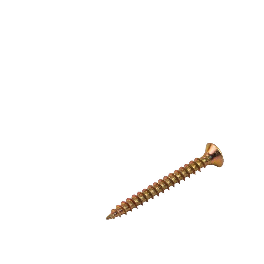 Саморез ШУж 3,5х35мм имеет потайную головку, крестообразный шлиц, острый наконечник и крупную резьбу. Выполнен из углеродистой стали, покрытие – желтый цинк.