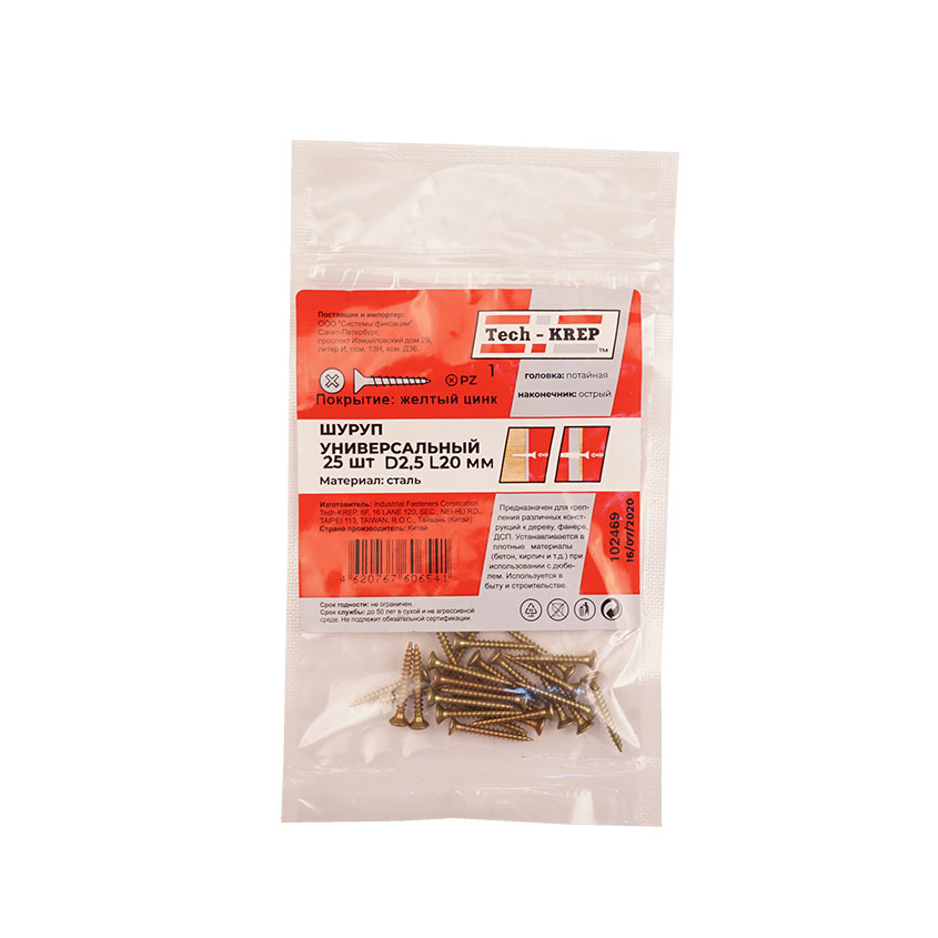Саморез ШУж 2,5х20мм имеет потайную головку, крестообразный шлиц, острый наконечник и крупную резьбу. Выполнен из углеродистой стали, покрытие – желтый цинк.
