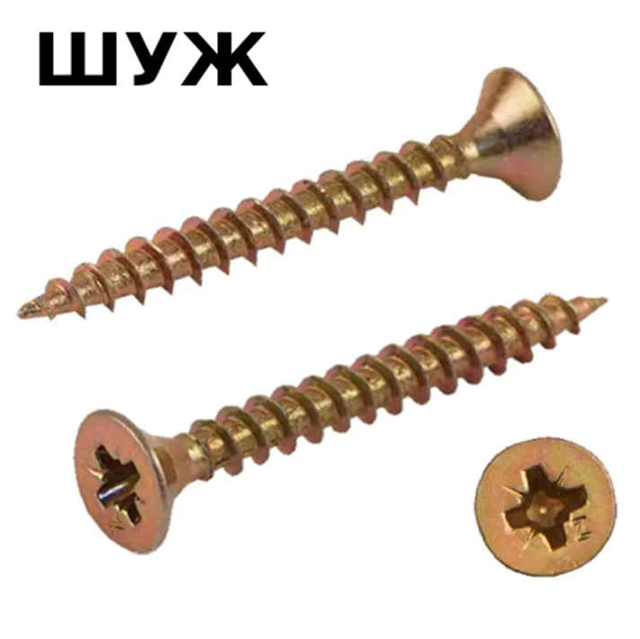 Это стальные саморезы с покрытием из желтого цинка. Они имеют потайную головку. За счет универсальной (средней) резьбы подходят и для мягких, и для твердых материалов. Могут использоваться со всеми видами дюбелей, обеспечивая лучший распор.