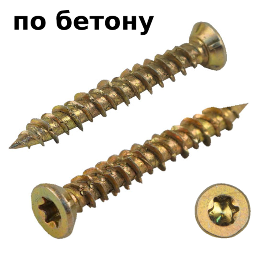 Это удлиненные цилиндрические крепежные элементы, имеющие резьбу, острый наконечник и головку со шлицем Torx. Шурупы по бетону изготавливают из углеродистой стали, благодаря чему они обладают хорошей прочностью, защищены от коррозии и прочих внешних воздействий. Используются в работе с кирпичными, пенобетонными и бетонными поверхностями.