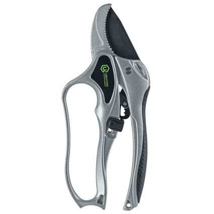 Секатор обладает уникальным механизмом, благодаря которому, можно резать древесину в несколько этапов с минимальным усилием.