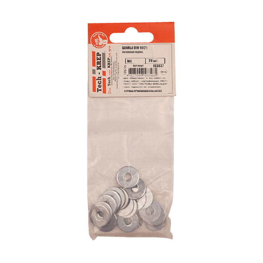 Шайба DIN9021 кузовная оцинкованная M6 изготовлена из углеродистой стали с антикоррозионным цинковым покрытием. Наружный диаметр шайбы в 2,5-3 раза больше внутреннего. Кузовная шайба отличается от обычной шайбы увеличенными полями. За счёт увеличенного поля шайбы обеспечивается наибольшая площадь соприкосновения, поэтому деревянные конструкции не деформируются.