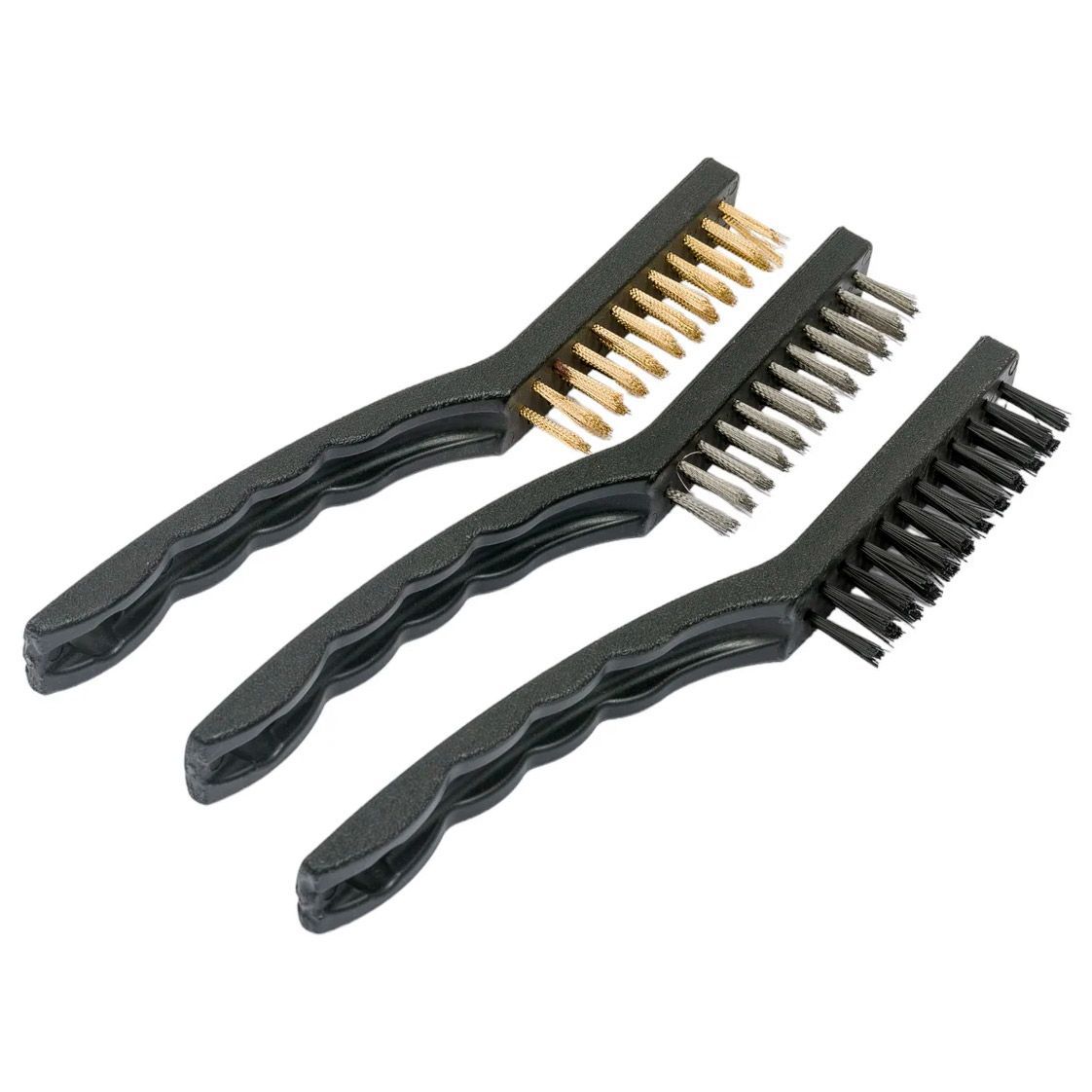 Каждая щётка в наборе имеет собственный тип щетины, изготовленной из нержавеющей стали, латунированной стали и полипропилена.