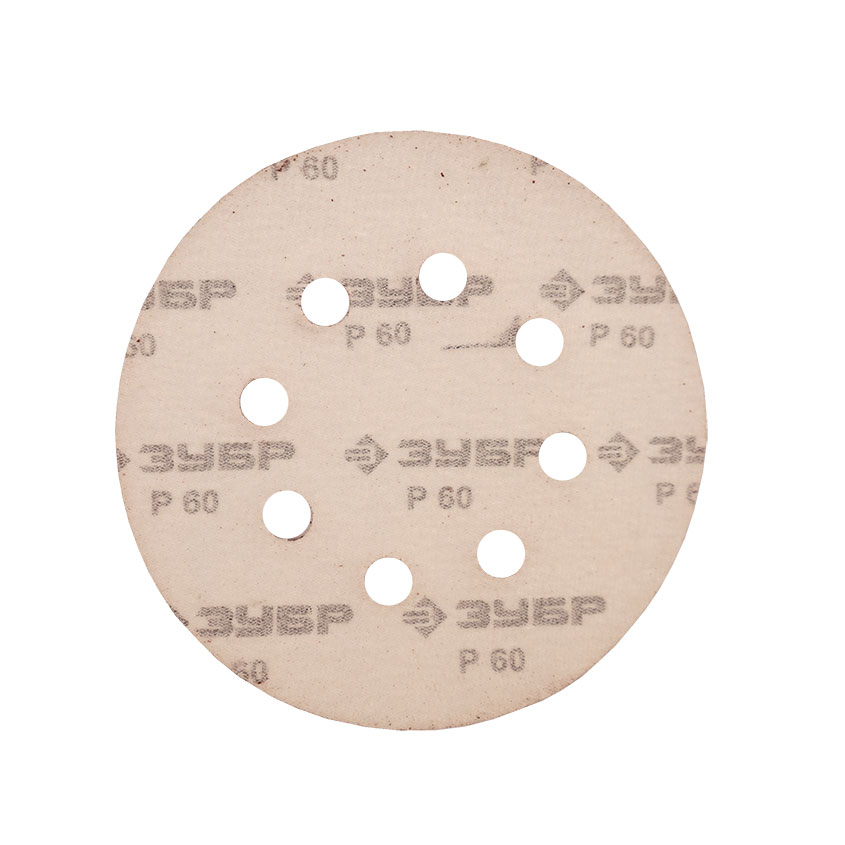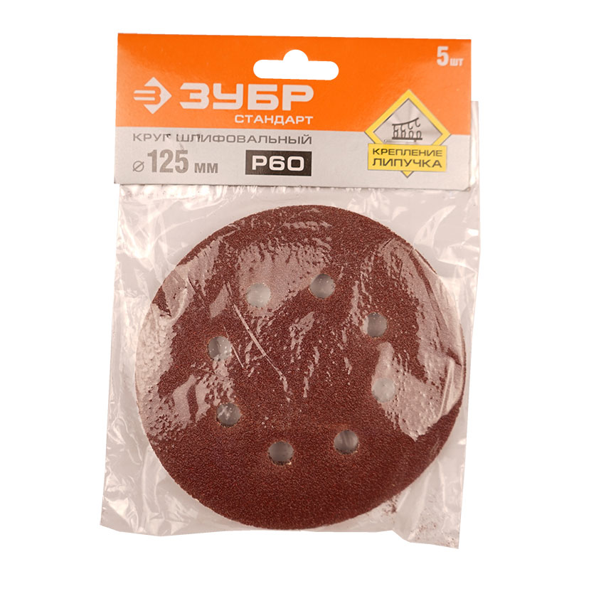 Шлифовальный круг диаметром 125мм от производителя Зубр. Крепится к инструменту при помощи велкро-основы (липучки). Изготовлен на бумажной основе, в качестве абразива использован электрокорунд нормальный. Зернистость Р60 предназначена для обдирочных работ.