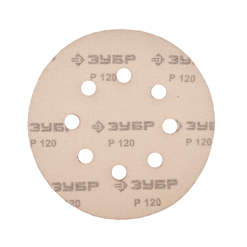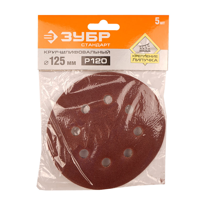 Шлифовальный круг диаметром 125мм от производителя Зубр. Крепится к инструменту при помощи велкро-основы (липучки). Изготовлен на бумажной основе, в качестве абразива использован электрокорунд нормальный. Зернистость Р120 предназначена для последующей обработки после проведения обдирочных работ.