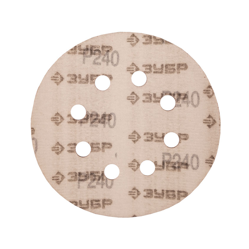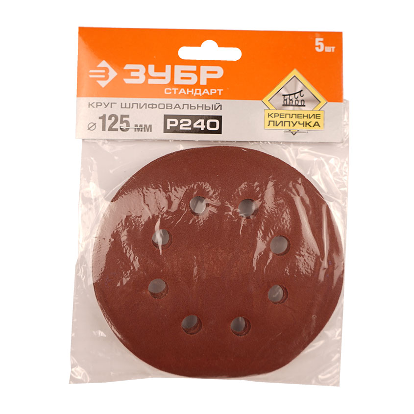 Шлифовальный круг диаметром 125мм от производителя Зубр. Крепится к инструменту при помощи велкро-основы (липучки). Изготовлен на бумажной основе, в качестве абразива использован электрокорунд нормальный. Зернистость Р240 предназначена для финишных работ.