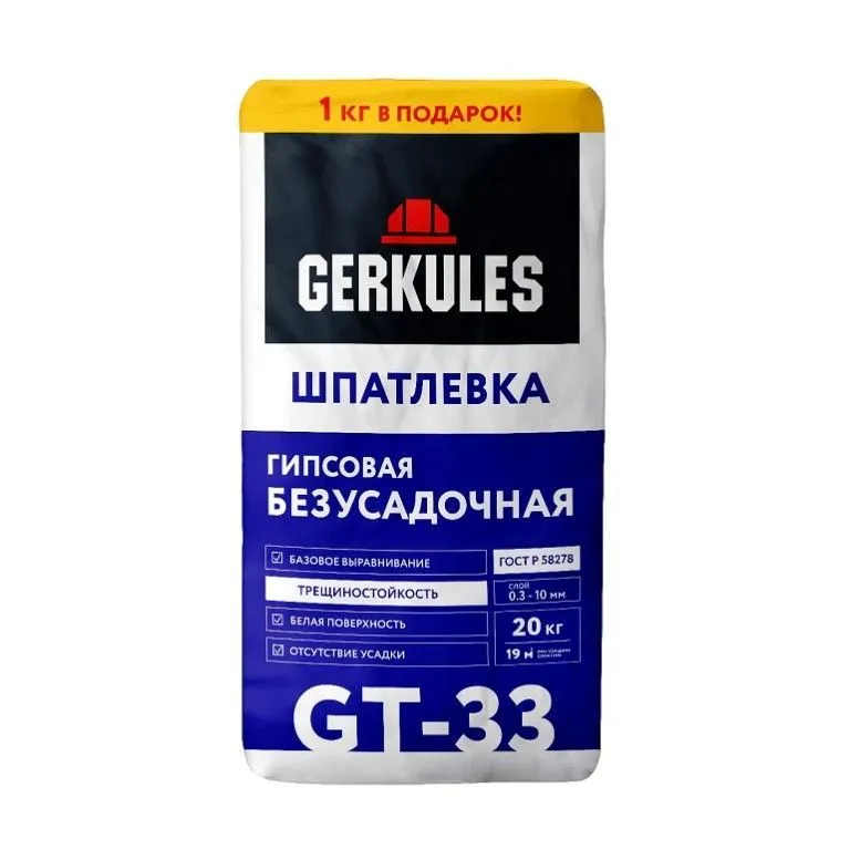 Шпатлевка универсальная Геркулес безусадочная GT-33 — высококачественная смесь на основе тонкого гипса и полимерных добавок.