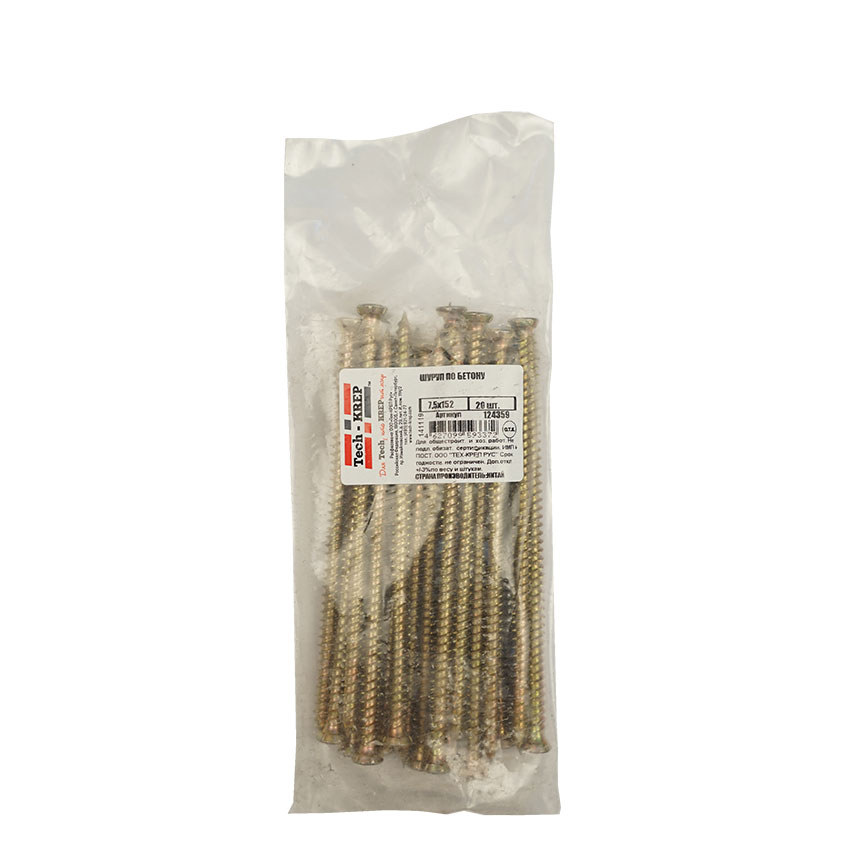 Шуруп по бетону 7,5x152мм изготавливается из высокопрочной стали. Благодаря технологии производства он приобретает устойчивость к коррозии, привлекательный внешний вид, гигиеничность и длительный срок эксплуатации. Резьба шурупа по бетону неравномерна, что обеспечивает надежную фиксацию крепежного элемента даже в неплотном бетоне.