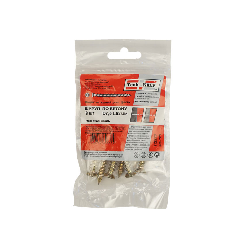 Шуруп по бетону 7,5x52мм изготавливается из высокопрочной стали. Благодаря технологии производства он приобретает устойчивость к коррозии, привлекательный внешний вид, гигиеничность и длительный срок эксплуатации. Резьба шурупа по бетону неравномерна, что обеспечивает надежную фиксацию крепежного элемента даже в неплотном бетоне.