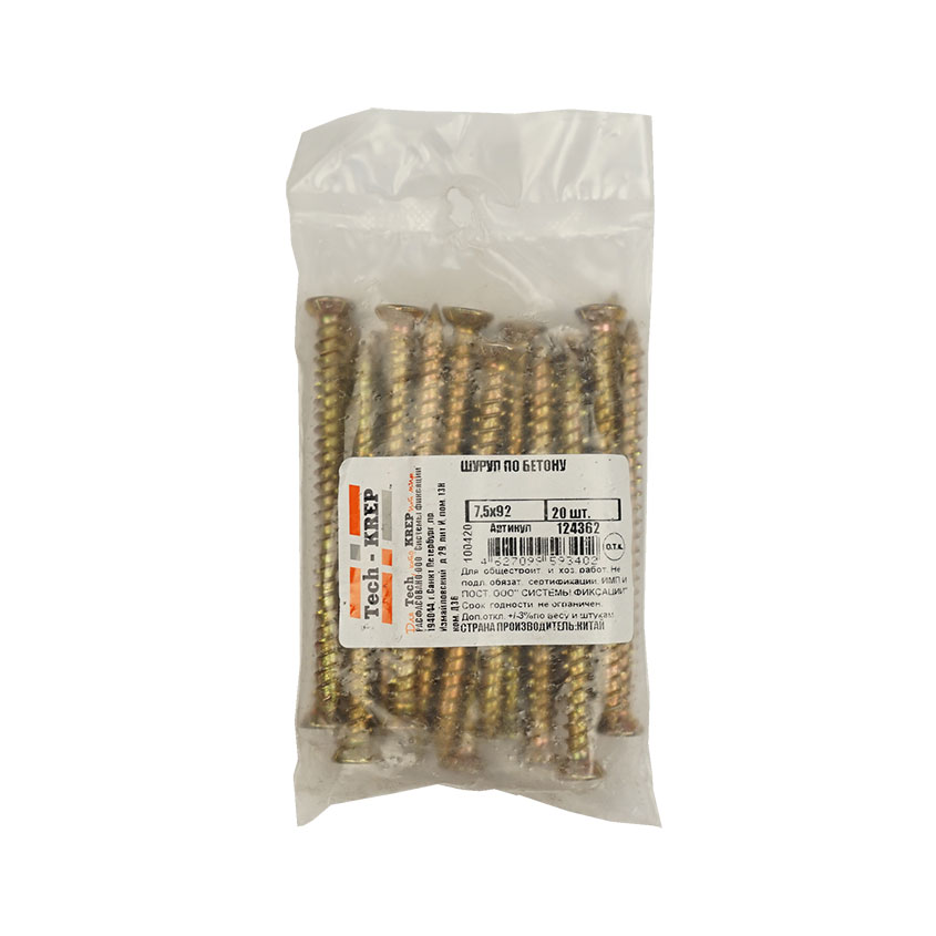 Шуруп по бетону 7,5x92мм изготавливается из высокопрочной стали. Благодаря технологии производства он приобретает устойчивость к коррозии, привлекательный внешний вид, гигиеничность и длительный срок эксплуатации. Резьба шурупа по бетону неравномерна, что обеспечивает надежную фиксацию крепежного элемента даже в неплотном бетоне.