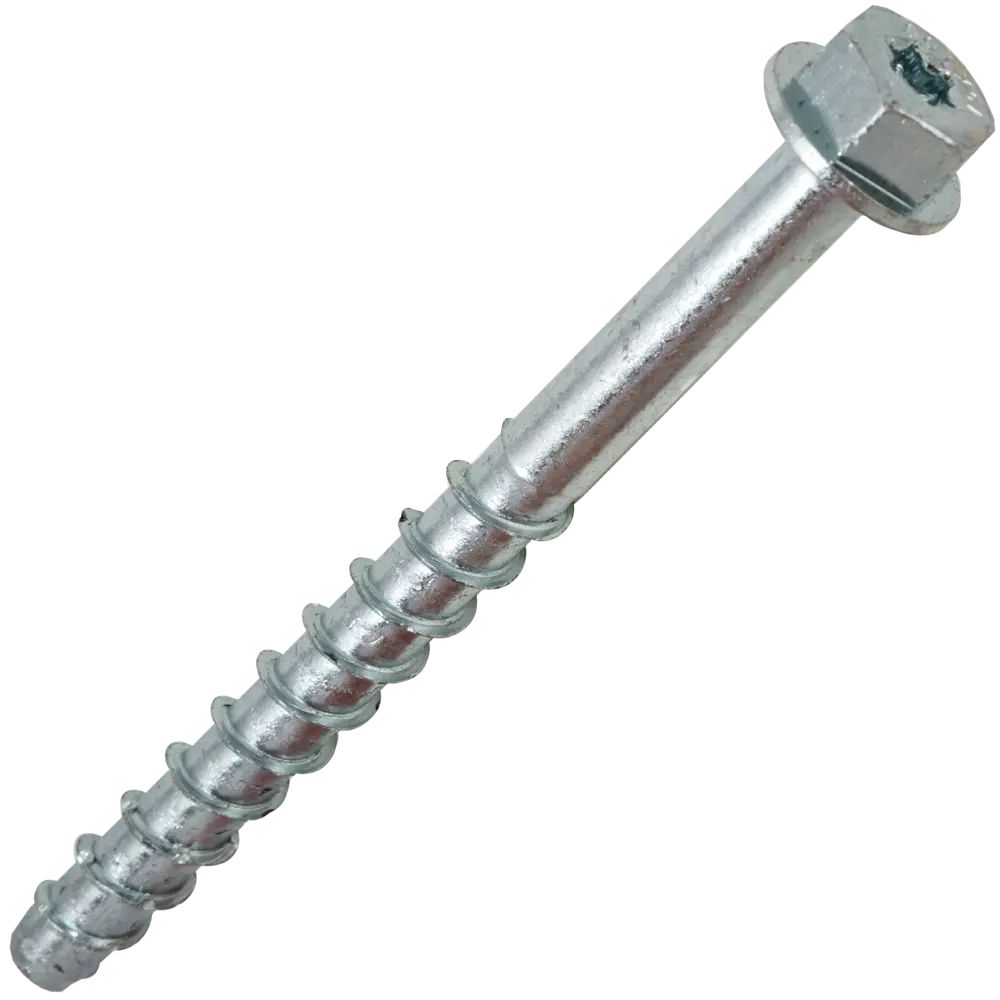 Шуруп по бетону оснащен шестигранной головкой со шлицем Torx (TX) и фланцем. Изготовлен из оцинкованной стали, предназначен для сквозной установки в бетон, бетонные плиты, полнотелый кирпич. Шлиц Torx обладает самой высокой степенью передачи крутящего момента от инструмента на шуруп. Страна производства — Россия.