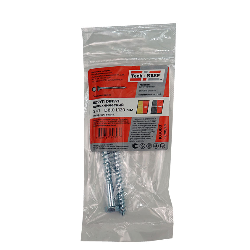 Шуруп сантехнический (глухарь) 8х120мм оцинкованный используется для крепления тяжелых конструкций к деревянному, бетонному или кирпичному основаниям (с использованием пластмассвого дюбеля). Шестигранная форма головки позволяет передать значительный момент при затяжке соединения.