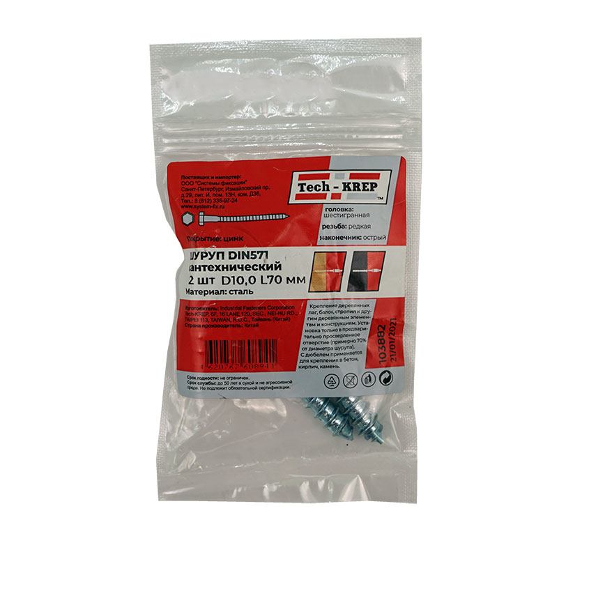 Шуруп сантехнический (глухарь) 10х70мм оцинкованный используется для крепления тяжелых конструкций к деревянному, бетонному или кирпичному основаниям (с использованием пластмассвого дюбеля). Шестигранная форма головки позволяет передать значительный момент при затяжке соединения.