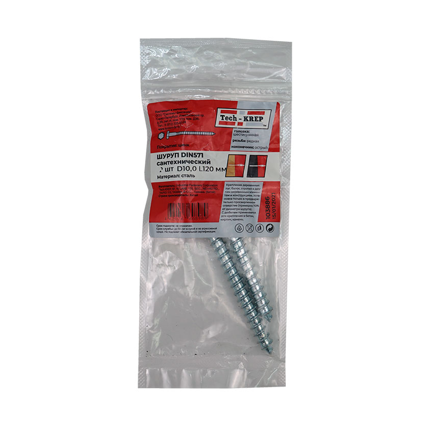 Шуруп сантехнический (глухарь) 10х120мм оцинкованный используется для крепления тяжелых конструкций к деревянному, бетонному или кирпичному основаниям (с использованием пластмассвого дюбеля). Шестигранная форма головки позволяет передать значительный момент при затяжке соединения.