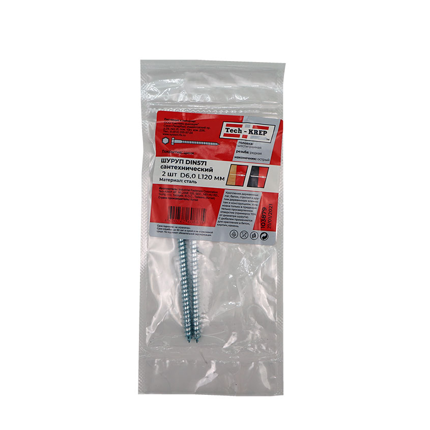 Шуруп сантехнический (глухарь) 6х120мм оцинкованный используется для крепления тяжелых конструкций к деревянному, бетонному или кирпичному основаниям (с использованием пластмассвого дюбеля). Шестигранная форма головки позволяет передать значительный момент при затяжке соединения.
