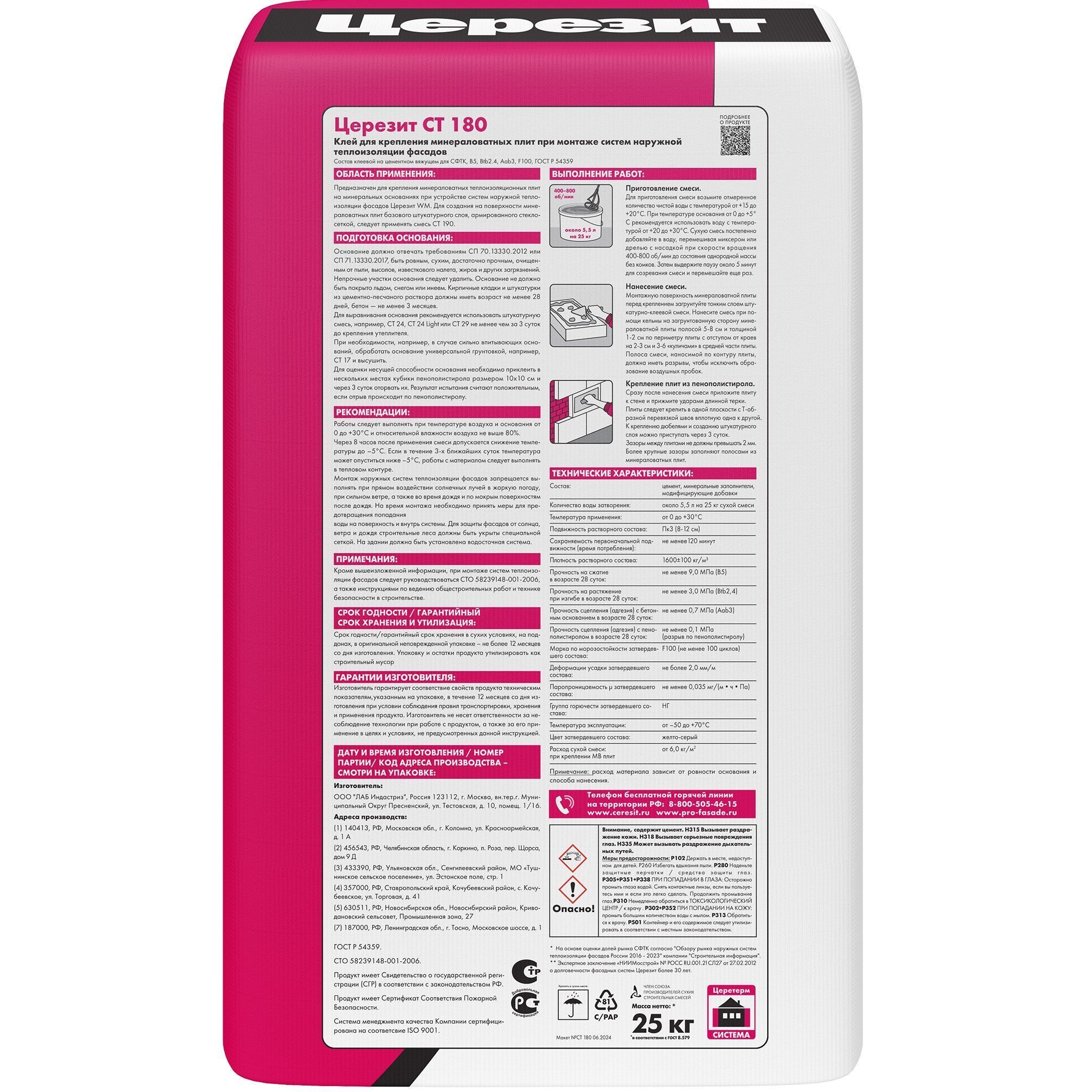 Штукатурно-клеевая смесь Ceresit CT 180 производится из смеси цемента, полимерных модификаторов и минеральных наполнителей. Применяется для крепления плит из минеральной ваты и создания базового штукатурного слоя при наружной теплоизоляции фасадов. Материал обладает высокой адгезией и содержит армирующие микроволокна.