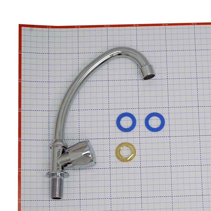 - Крепление к столешнице или мойке осуществляется с помощью латунной гайки и прокладок. Подключение воды - непосредственно к штуцеру крепления.