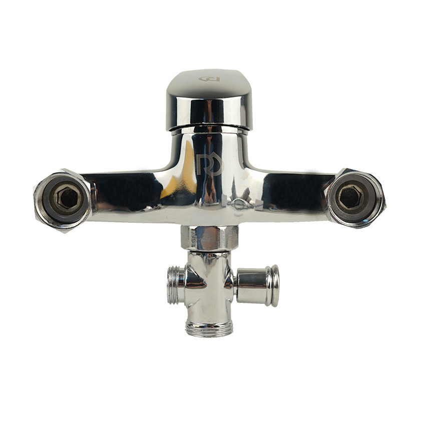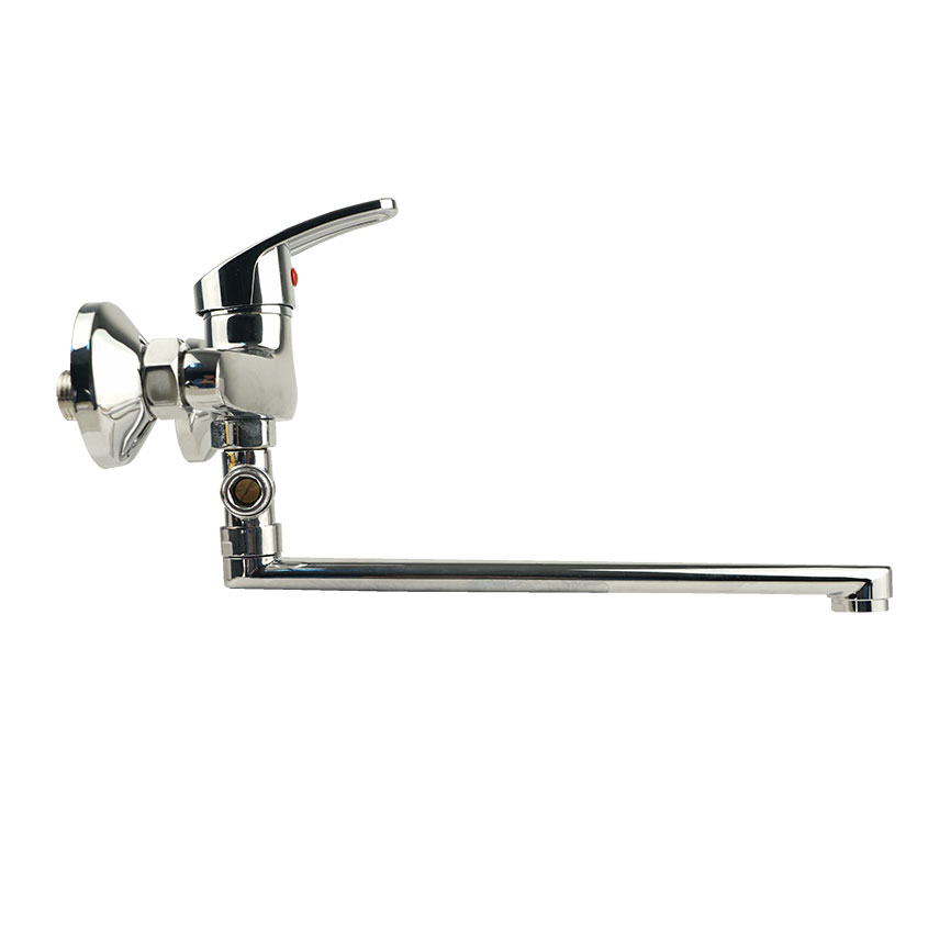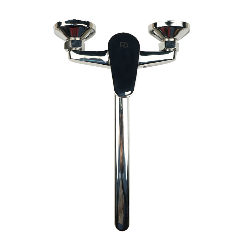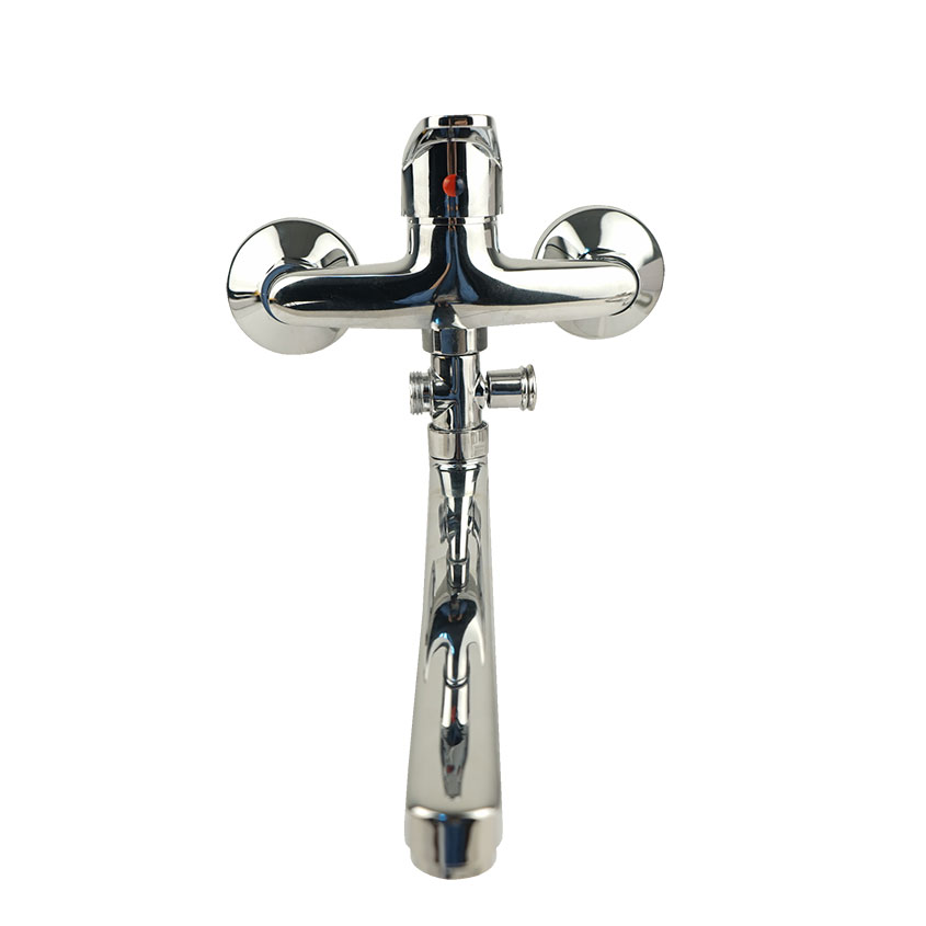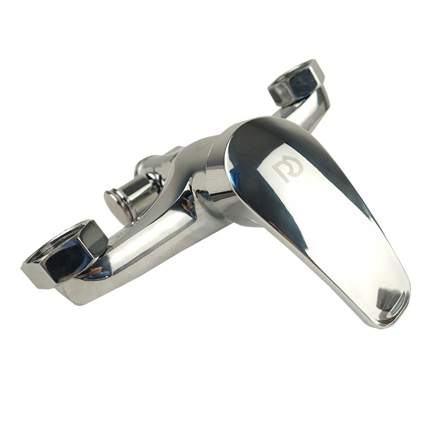 Однозахватрый пристенный смеситель для ванны с ручкой типа "B" из цинкового сплава и с отверстием на рычаге. Картридж металлокерамический 35 мм. Комплект пристенного крепления включает в себя уплотнительные прокладки, эксцентрики и глубокие хромированные чашки отражателей. Дивертор (переключатель) с излива на душ наружный, штокового типа.