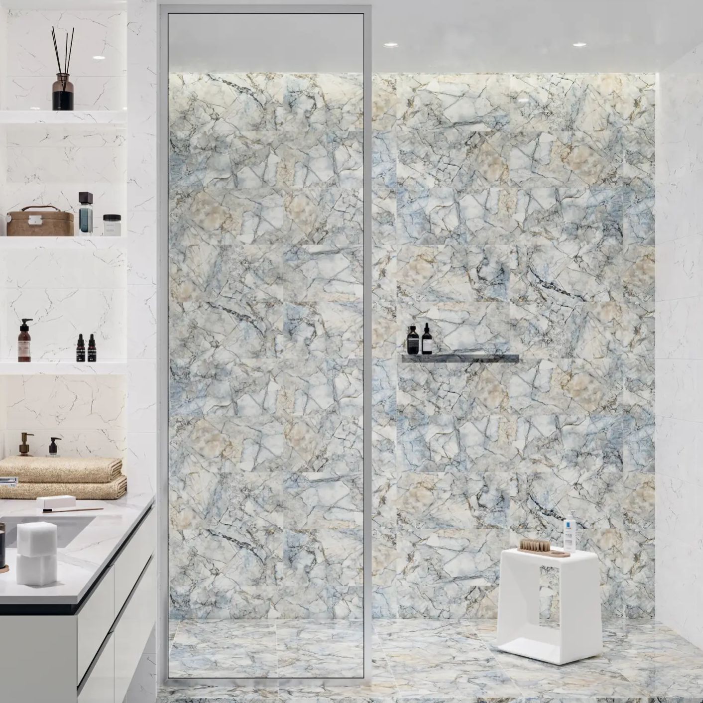 Solo – это имитация трендового цветного мрамора с необычным оттенком небесной синевы, который подчеркивается серо-бежевыми включениями, характерными для натурального камня. Особенность структуры этого мрамора – тонкие серые прожилки, многие из которых пересекаются, образуя ломанные и крестообразные линии, придавая поверхности 3D-эффект. В сочетании с белым мрамором коллекция гармонично впишется в современные интерьеры, для которых характерны простор, обилие света и лаконичность.