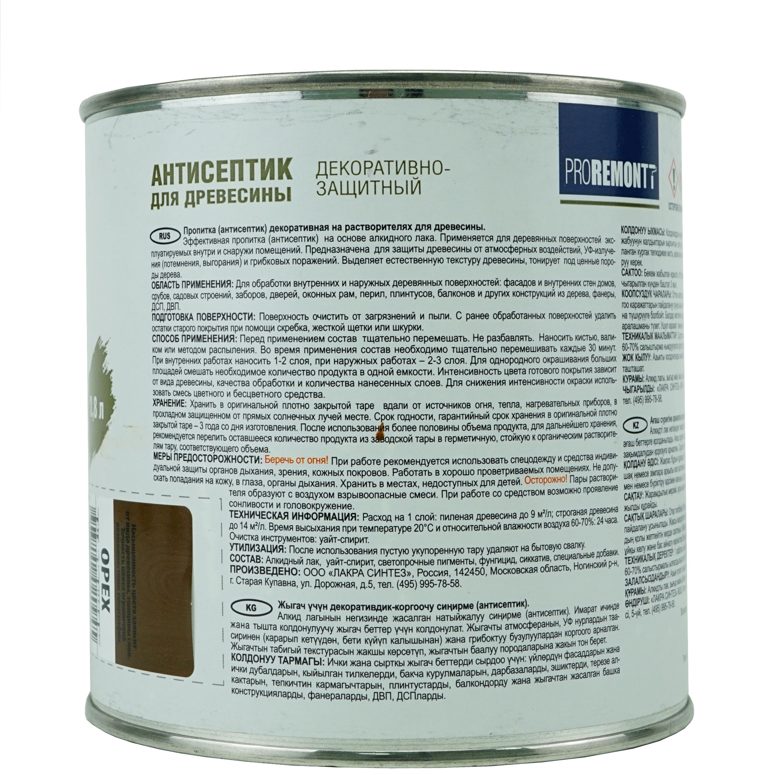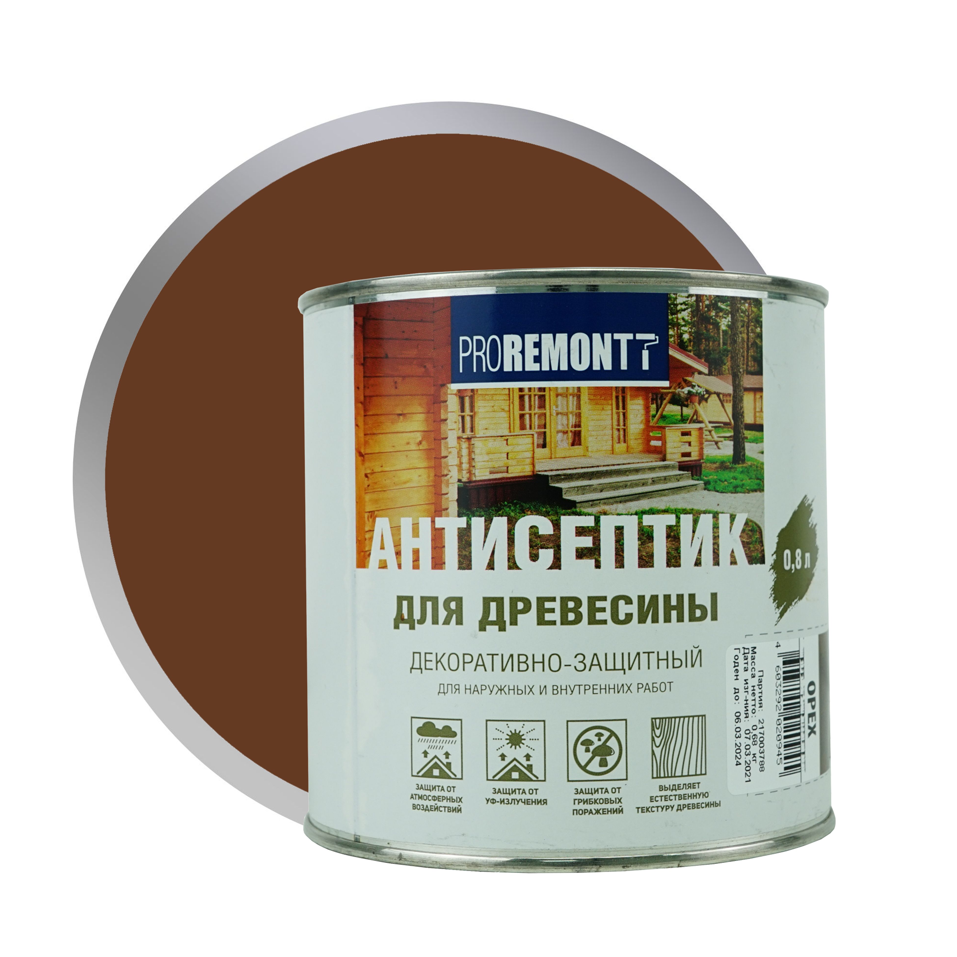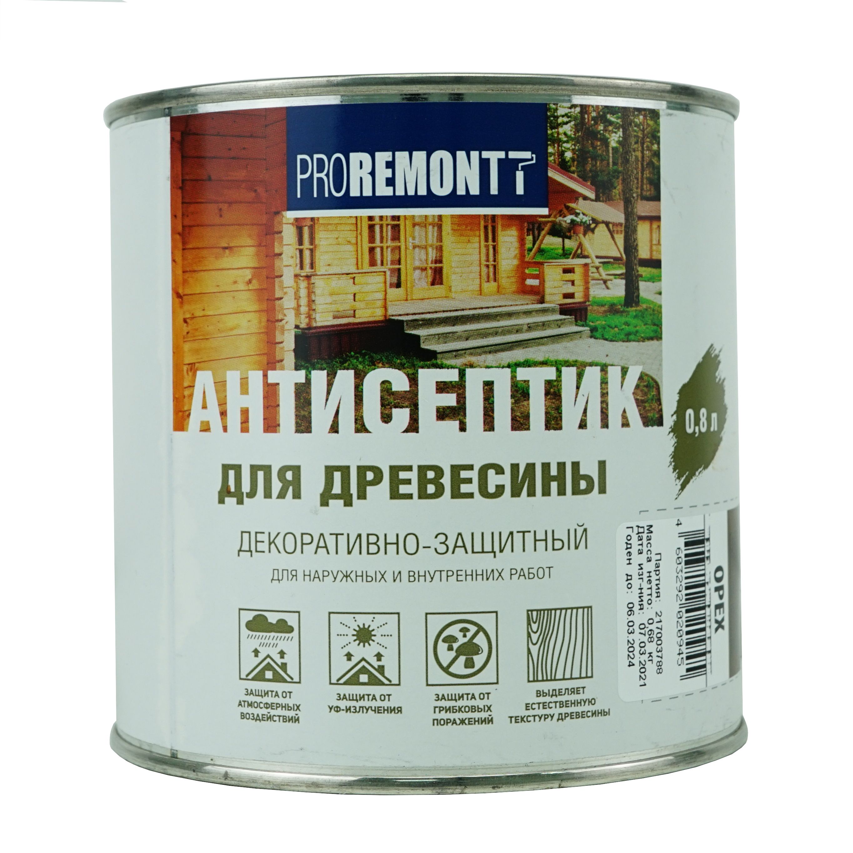 Состав деревозащитный Проремон орех. Эффективная пропитка (антисептик ) на основе алкидного лака.Цветовая палитра: коричневый. Состав: Алкидный лак, уайт-спирит, светопрочные пигменты, фунгицид, сиккатив, специальные добавки.
