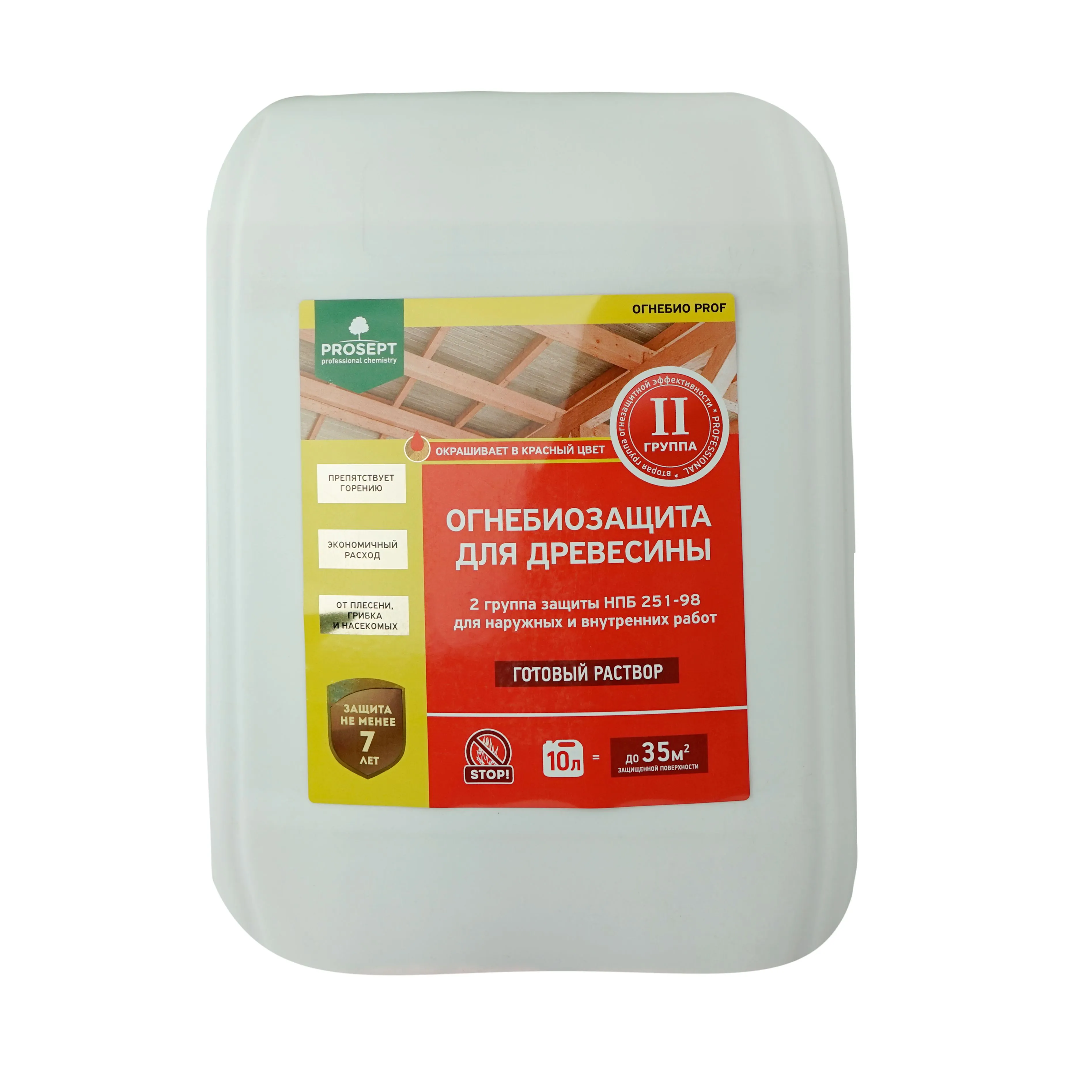 Пропитка защищает от возникновения и распространения огня, а также от воздействия насекомых и грибков. Переводит древесину в трудновоспламеняемый материал. Подходит для обработки как новых конструкций, так и ранее обработанных огнезащитными составами.