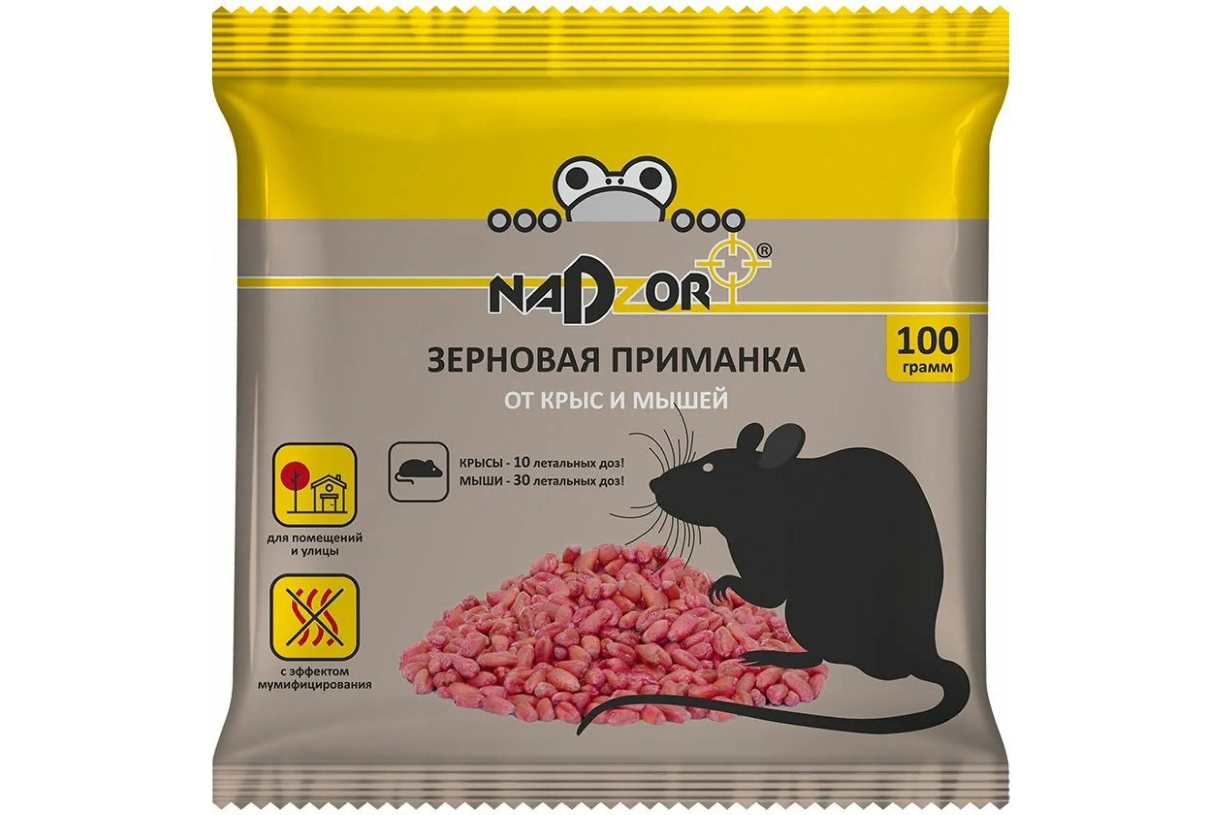Зерновая приманка от мышей и крыс Nadzor 100 г - универсальная приманка для уничтожения мышей и крыс. Основу составляет зерно, которое так любят грызуны. Активное действующее вещество последнего поколения (бромадиолон 0.005 %) обеспечивает гибель грызунов на 3-7 день после однократного поедания ими приманки.