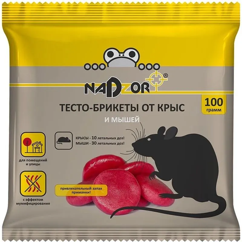 Тесто-брикет от крыс и мышей Nadzor. Данная форма приманки создана специально для борьбы с крысами, так как в своем обычном питании крысы, в отличие от мышей, предпочитают не столько зерно, сколько разнообразный кормрастительного и даже животного происхождения, и тесто-брикеты отвечают этим предпочтениям. Мягкая масса в виде теста, содержащая активное действующее вещество и комплекс привлекателей, упакована в индивидуальные пакетики из фильтр-бумаги, которые позволяют легко дозировать приманку и не соприкасаться с ней. Активное действующее вещество последнего поколения обеспечивает гибель грызунов на 3-7 день после однократного поедания ими приманки.