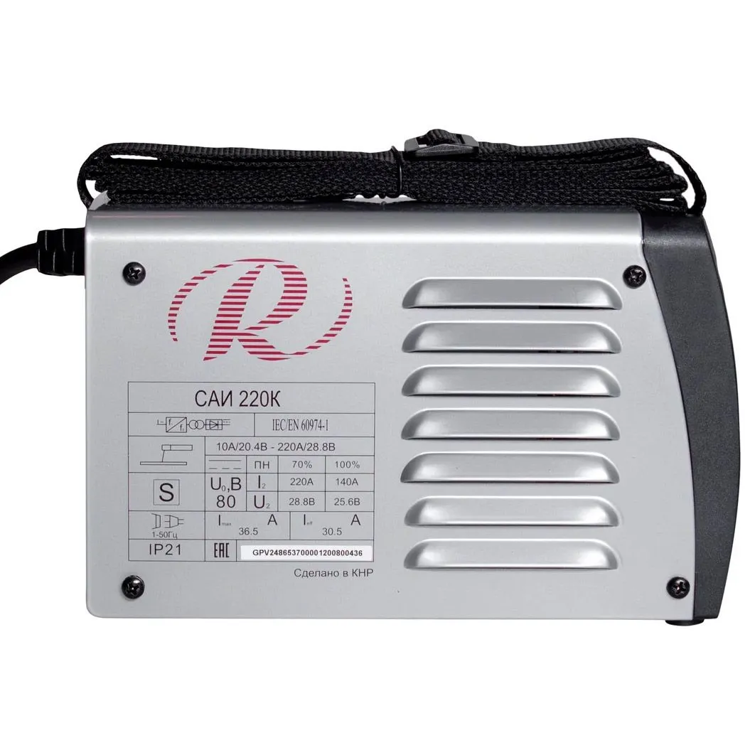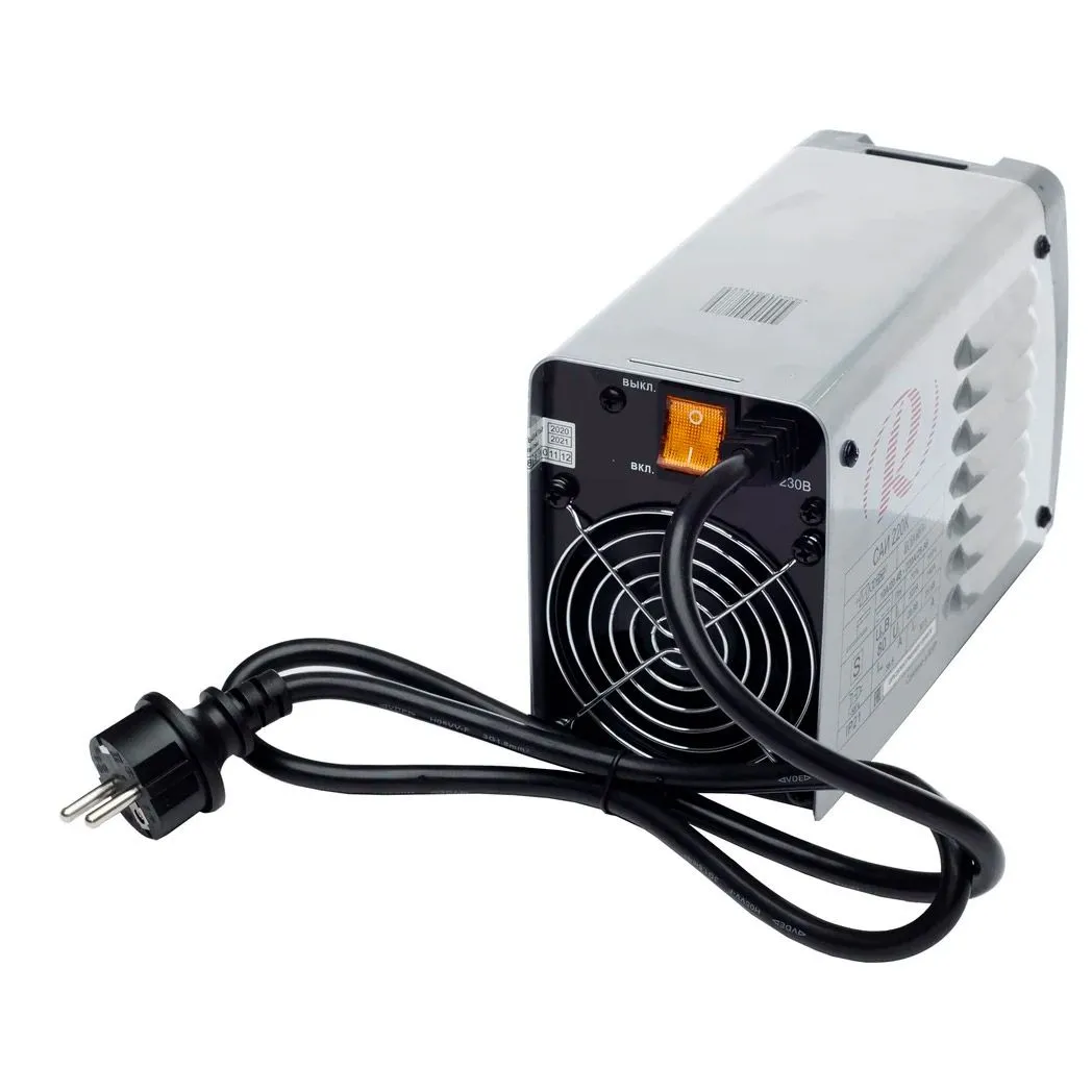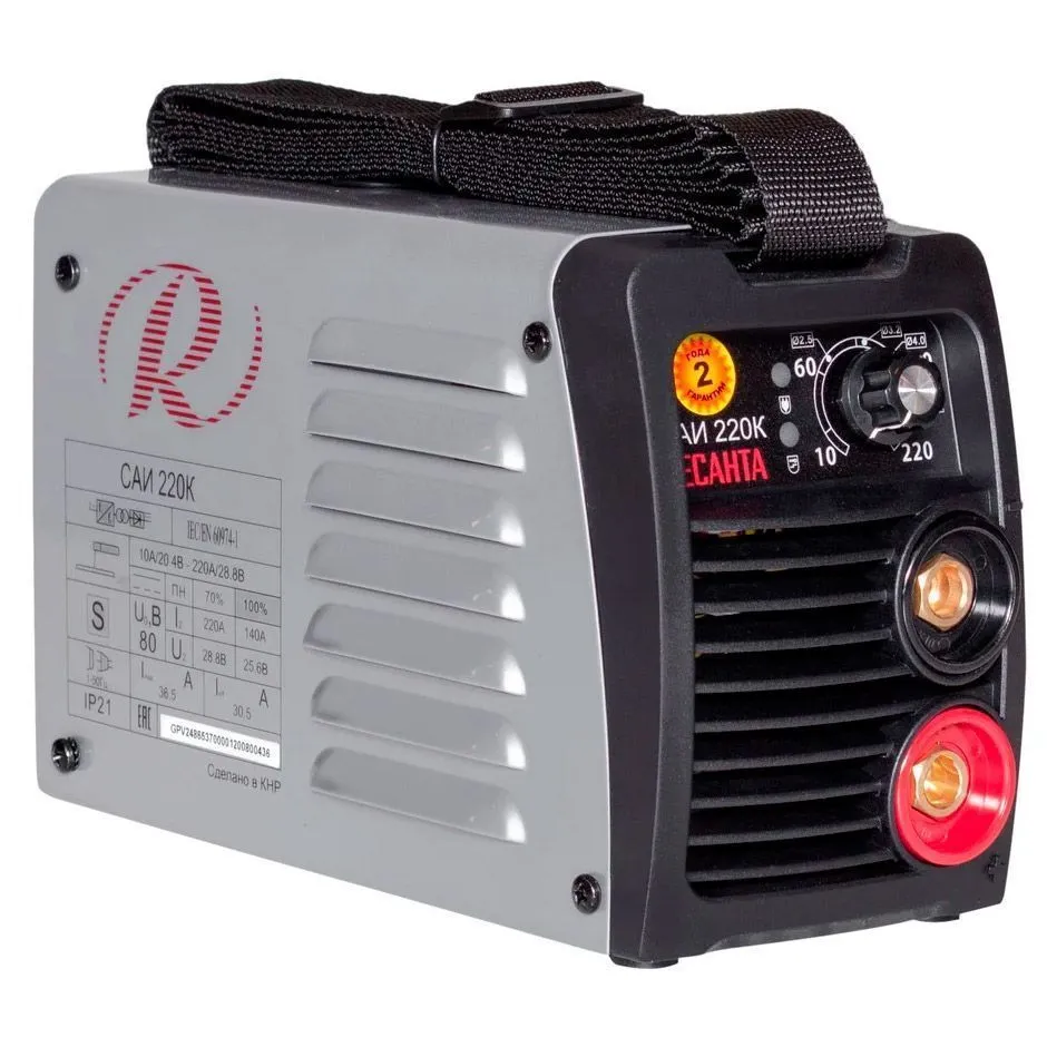 Компактная модель весом 4,22 кг с ремнем для удобной переноски подойдет для использования на труднодоступных участках. Работа в режиме ММА предполагает применение плавящихся электродов размером до 5 мм, которые одновременно выполняют роль присадки. Силу сварочного тока можно регулировать с помощью специальной ручки в диапазоне от 10 до 220 А. Устройство отличается низким энергопотреблением, стабильной работой при низком напряжении (140-240 В). Для защиты от перегрева сварочный аппарат оснащен принудительной вентиляцией и тепловым реле, которое автоматически отключает систему при превышении допустимой температуры. Данная модель имеет высокую продолжительность постоянной нагрузки (70%) и отличается высоким КПД (80%). В ней также предусмотрены опции Antistick (снижение тока в случае залипания электрода), HOT START (плавный старт с автоматическим повышением тока), ARC FORCE (обеспечение устойчивости дуги)