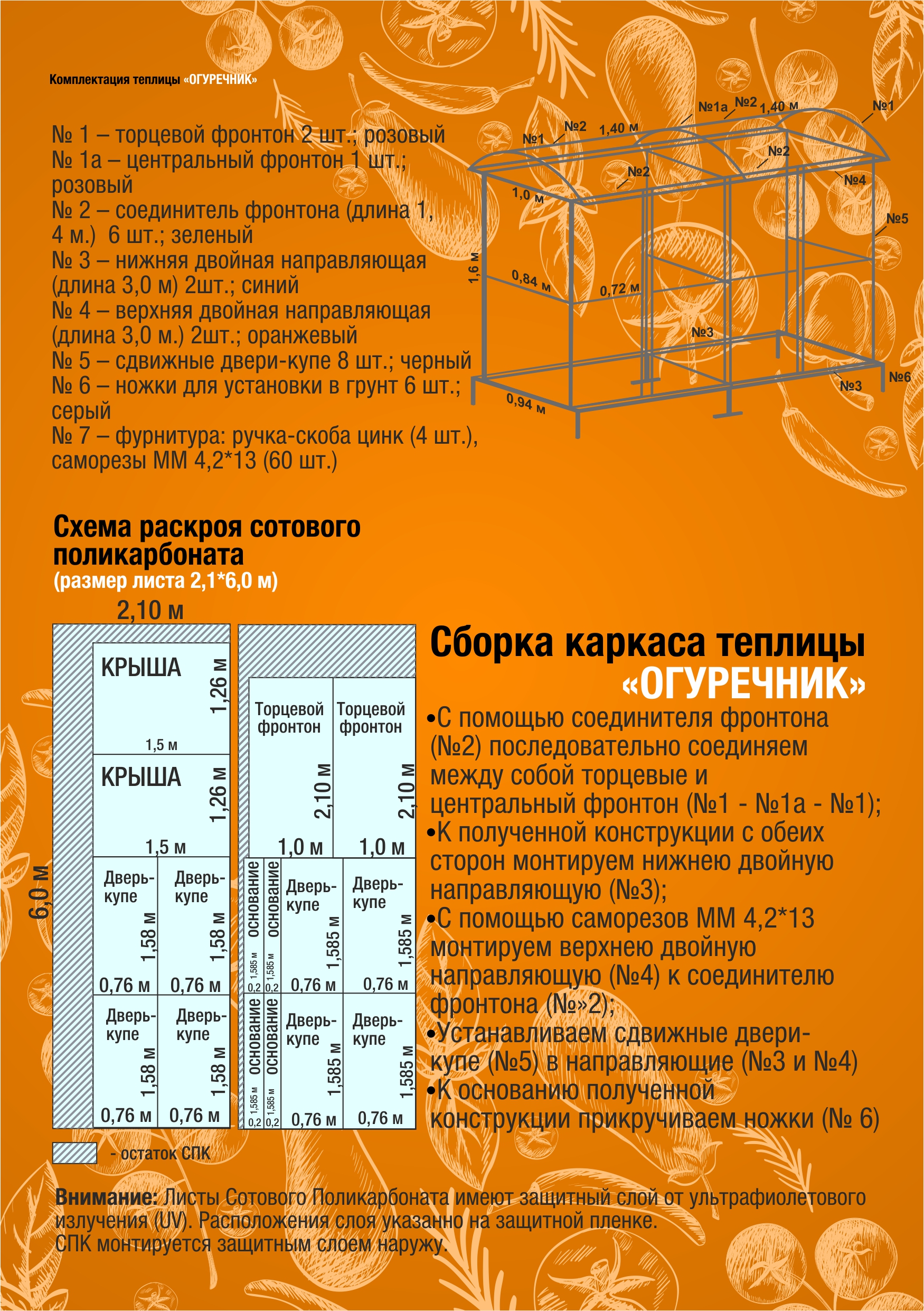 Устанавливается на стойки в грунт.При установки теплицы, необходимо учесть, что почва к моменту монтажа должна немного оттаять, чтобы выровнять площадку, вкопать основание. Потребуется 2 листа поликарбоната.