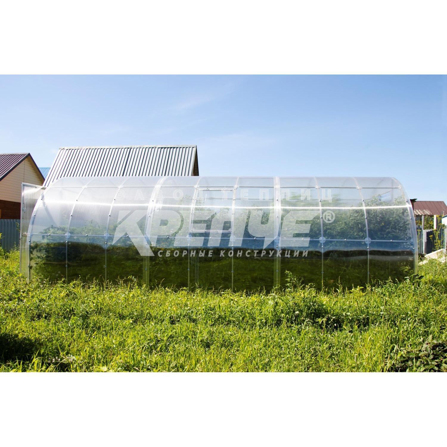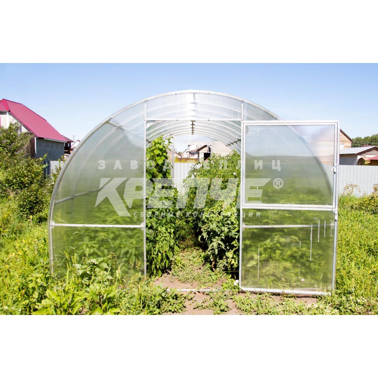 Каркас сделан из оцинкованной квадратной трубы сечением 20х20, расстояние между дугами 65 сантиметров, дуги скреплены 7 продольными перемычками. Ширина каркаса 3 метра, высота 2,1 метра, длина 4 метра. Дуги и перемычки скреплены между собой краб-системой. Каркас имеет две двери шириной 1 метр (с каждой из сторон), на каждой двери имеется форточка для проветривания. Двери и форточки снабжены удобными ручками для открывания, а также крючками для фиксирования. Данная модель имеет снеговую нагрузку до 150 кг на м2, установки подпорок в зиму не требует. Теплица крепится к грунту анкерами длиной 1 метр.