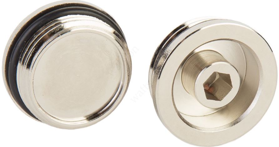 Латунная никелированная пробка c наружной резьбой, используемая для закрытия неиспользуемого присоединительного отверстия коллектора с условным диаметром 1". Головка – шестигранной формы, под гаечный ключ. Уплотнение – кольцо из синтетического каучука EPDM.