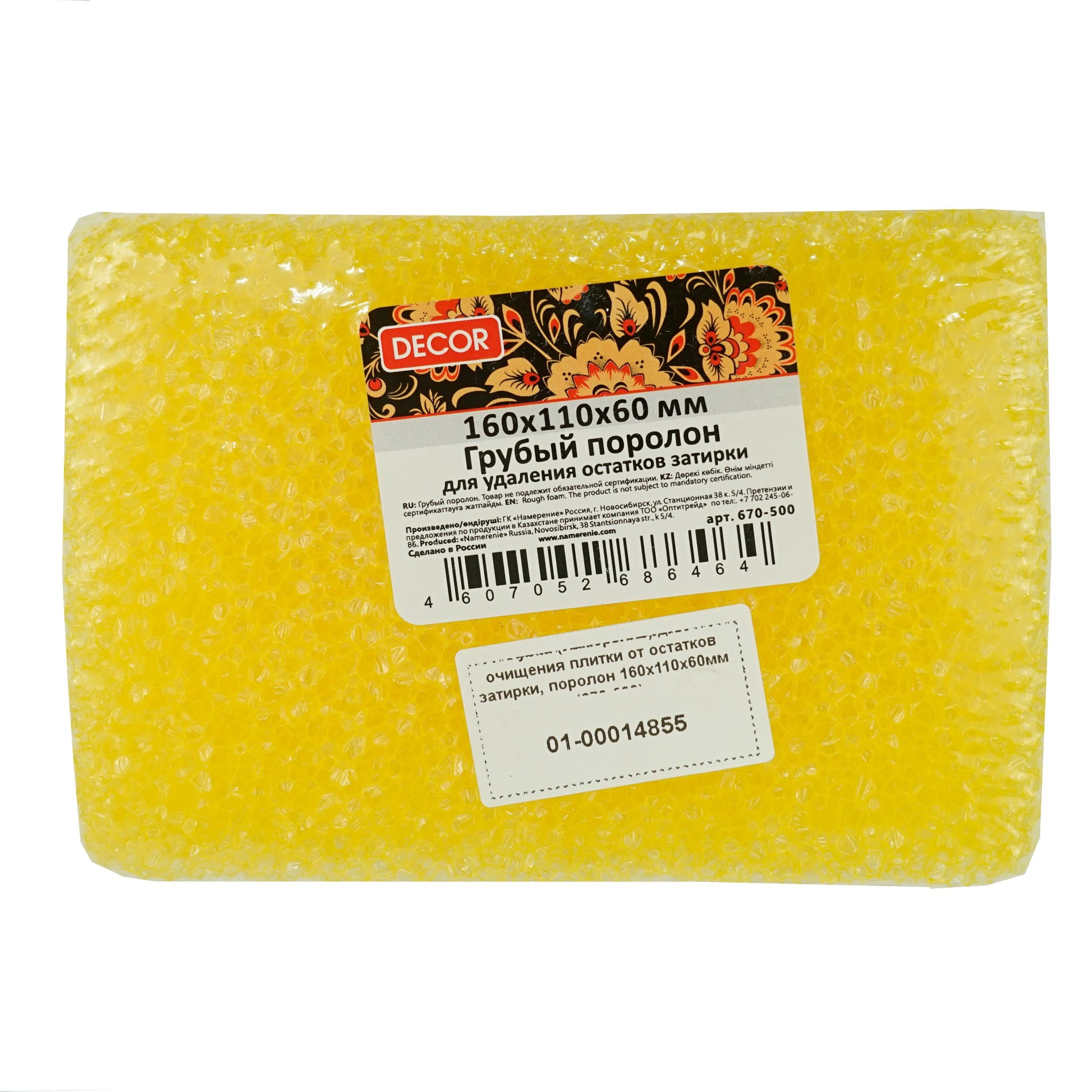 Губка (DECOR) для очищения плитки от остатков затирки – изделие, используемое для очистки керамических и других гладких поверхностей. Губка имеет классическую прямоугольную форму.