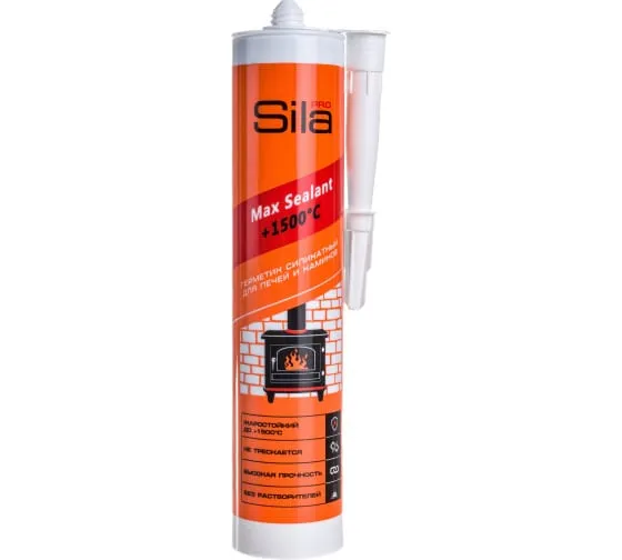 SILA PRO MAX SEALANT +1500°C – жаростойкий силикатный герметик для герметизации печных соединений, огнезащитных дверей, перегородок, дымоходов, вентиляционных шахт, а также для заделывания трещин в бетоне. Отверждается за счёт испарения воды. После полного высыхания, образует прочный огнеупорный жесткий шов, способный выдержать температуру до +1200 °С и кратковременно (до 30 минут) до +1500 °С. Используя огнеупорный герметик Sila PRO Max Sealant +1500°C, вы получите хорошую тягу в дымоходе и надежную защиту помещения от проникновения дыма и угарного газа.
