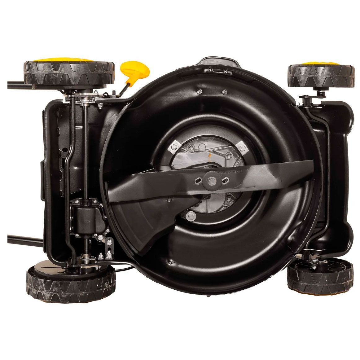 - Мощность бензогазонокосилки – 5 л. с., что существенно превышает потенциал любого электрического аналога. Ширина среза – 460 мм, а высоту расположения ножей можно выбирать из 7 возможных вариантов в диапазоне от 25 до 75 мм;