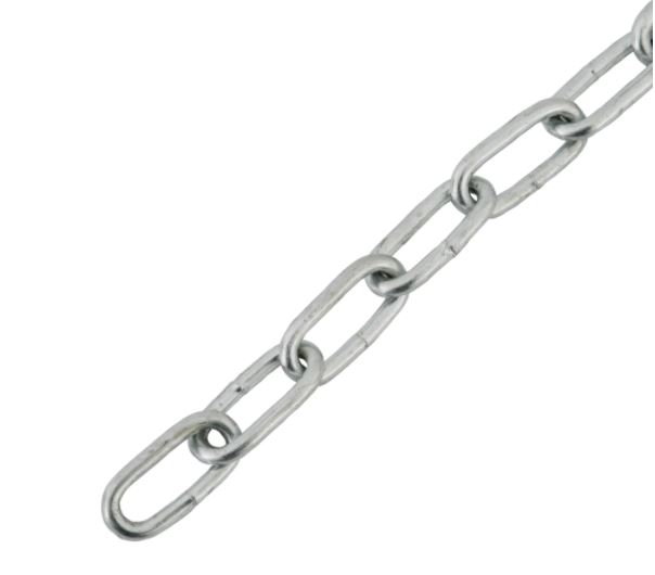 Цепь длиннозвенная DIN 763 применяется в строительных и общехозяйственных работах для подвешивания статичных тяжелых предметов, для закрепления груза, в качестве растяжки, для создания декоративных и временных ограждений. Цепь с длинным звеном меньше весит и легче регулируется по длине, чем короткозвенная, при этом уступает последней по прочности.