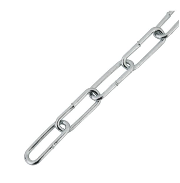Цепь длиннозвенная DIN 763 применяется в строительных и общехозяйственных работах для подвешивания статичных тяжелых предметов, для закрепления груза, в качестве растяжки, для создания декоративных и временных ограждений. Цепь с длинным звеном меньше весит и легче регулируется по длине, чем короткозвенная, при этом уступает последней по прочности.