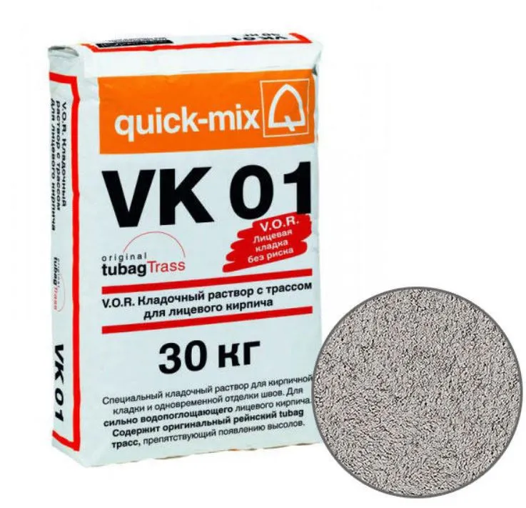 Цветной кладочный раствор quick-mix VK 01 с трассом для выполнения кирпичной кладки и одновременной отделки швов (в одном рабочем цикле) при использовании сильно водопоглощающего лицевого кирпича с водопоглощением ~ 8-10%. Кладка устойчива к погодным условиям, в т.ч. к прямому дождю, риск образования высолов на поверхности швов кладки минимален.