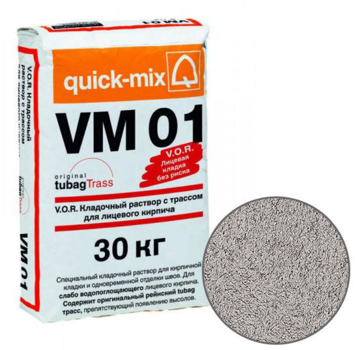 Цветной кладочный раствор quick-mix VM 01 с трассом для выполнения кирпичной кладки и одновременной отделки швов (в одном рабочем цикле) при использовании слабо водопоглощающего лицевого кирпича с водопоглощением ~ 3-8%%. Кладка устойчива к погодным условиям, в т.ч. к прямому дождю, риск образования высолов на поверхности швов кладки минимален.