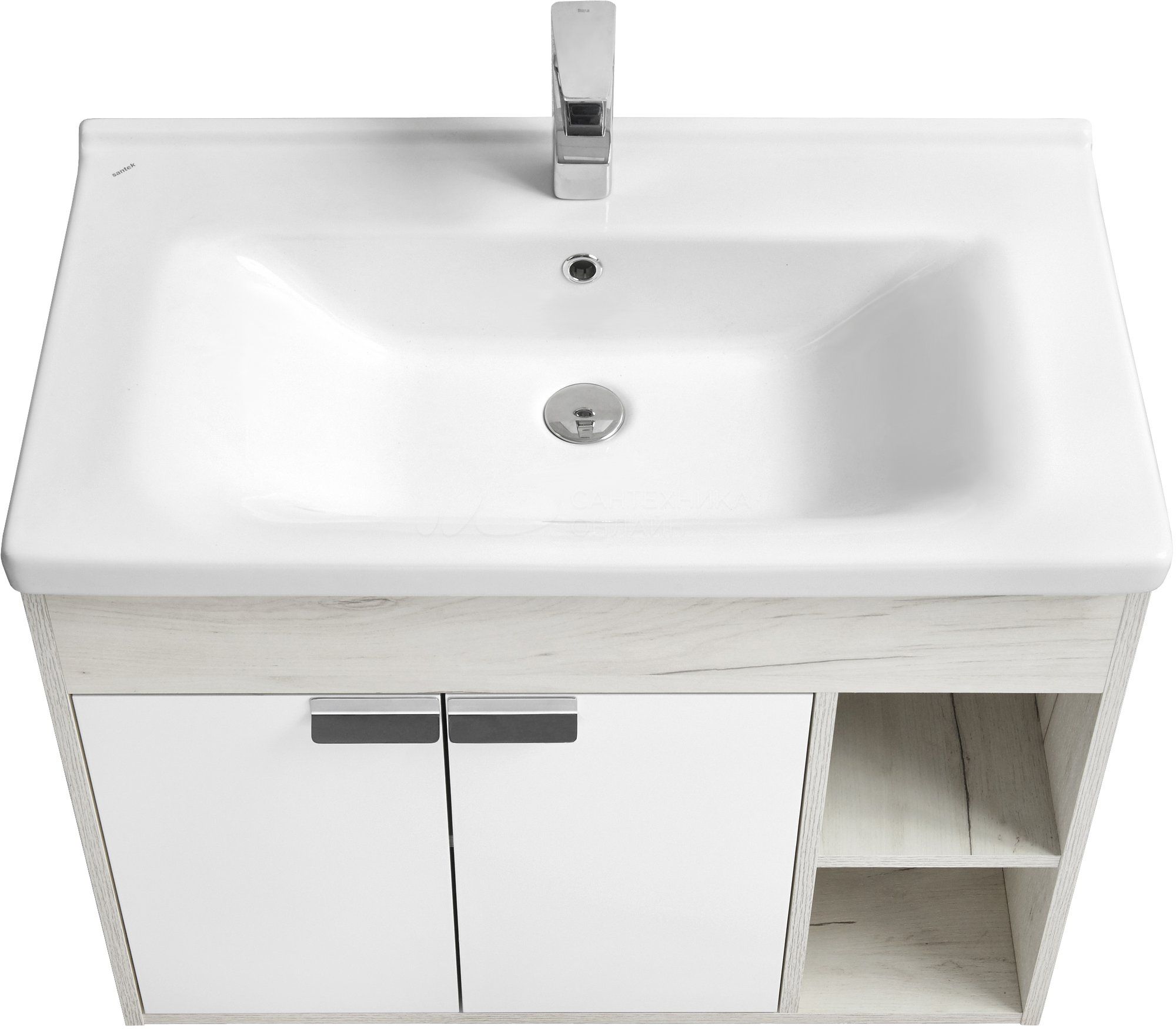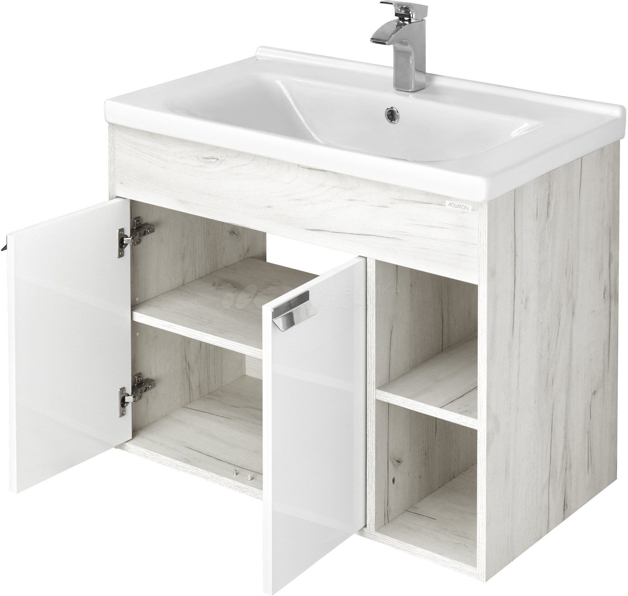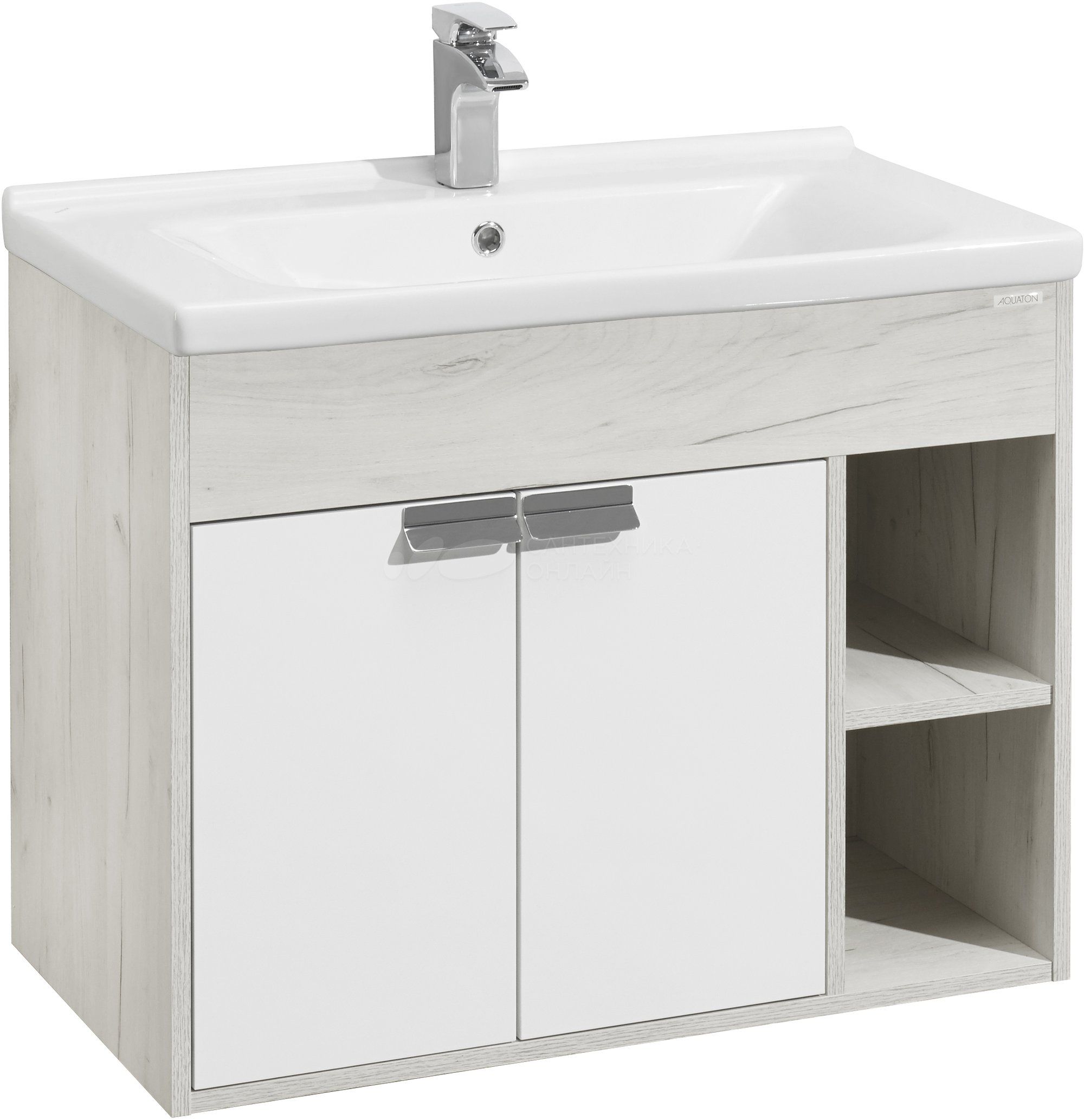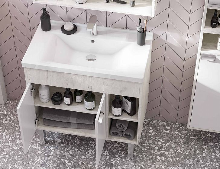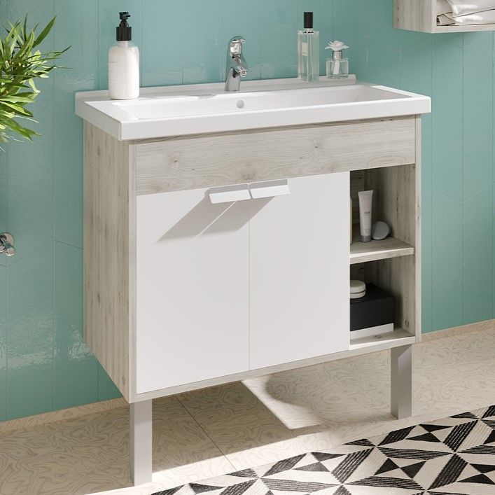 Тумба Флай 80 в современном стиле сочетает в себе два цвета: белоснежный глянец и трендовый декор дуб крафт. Выполненная из влагостойкой ламинированной плиты тумба обладает простым и удобным функционалом: слева за распашными фасадами-створками находится вместительное отделение с регулируемой по высоте полкой в цвете дуб крафт, а справа - две открытые ниши, на которых так приятно разместить красивые мелочи и декор для ванной комнаты. Фасады открываются с помощью изящной и оригинальной ручки от европейского производителя (Испания), петли снабжены доводчиками. Тумба комплектуется белоснежной прямоугольной керамической раковиной Миранда бренда Santek. Фасады тумбы окрашены полиэфирной краской ультрафиолетового отверждения. Такой способ окрашивания обеспечивает изделию привлекательный внешний вид, а также износостойкость и долговечность.