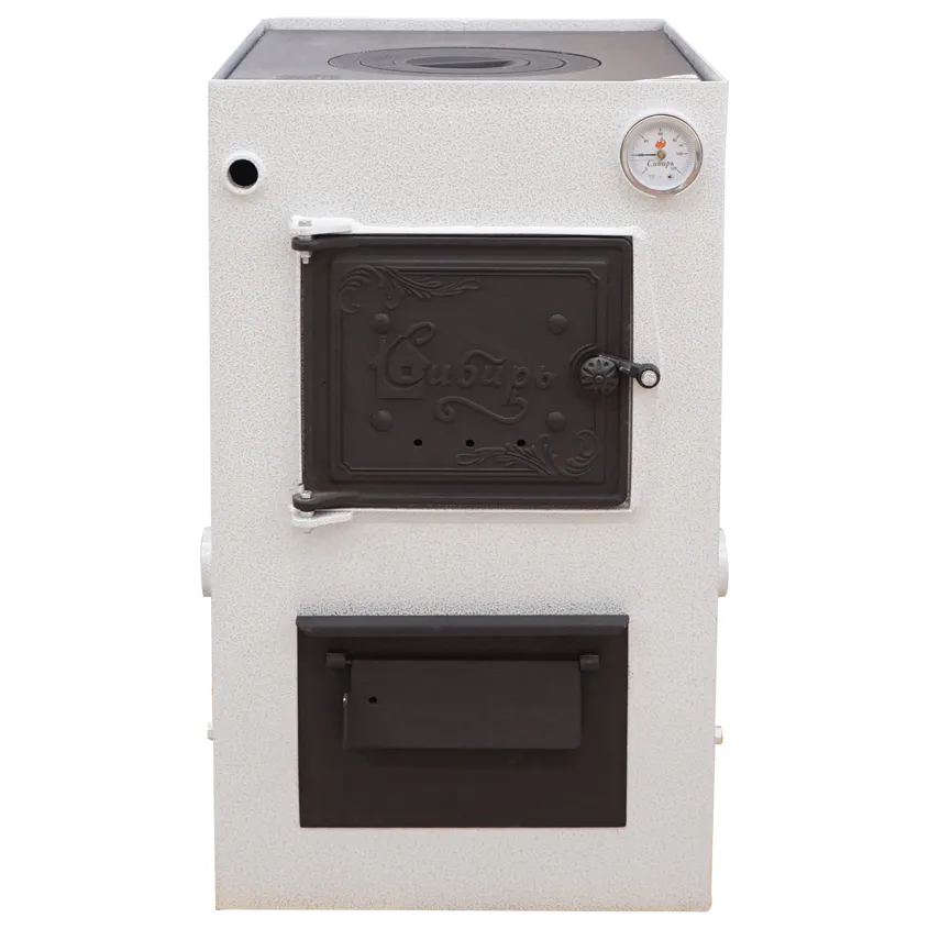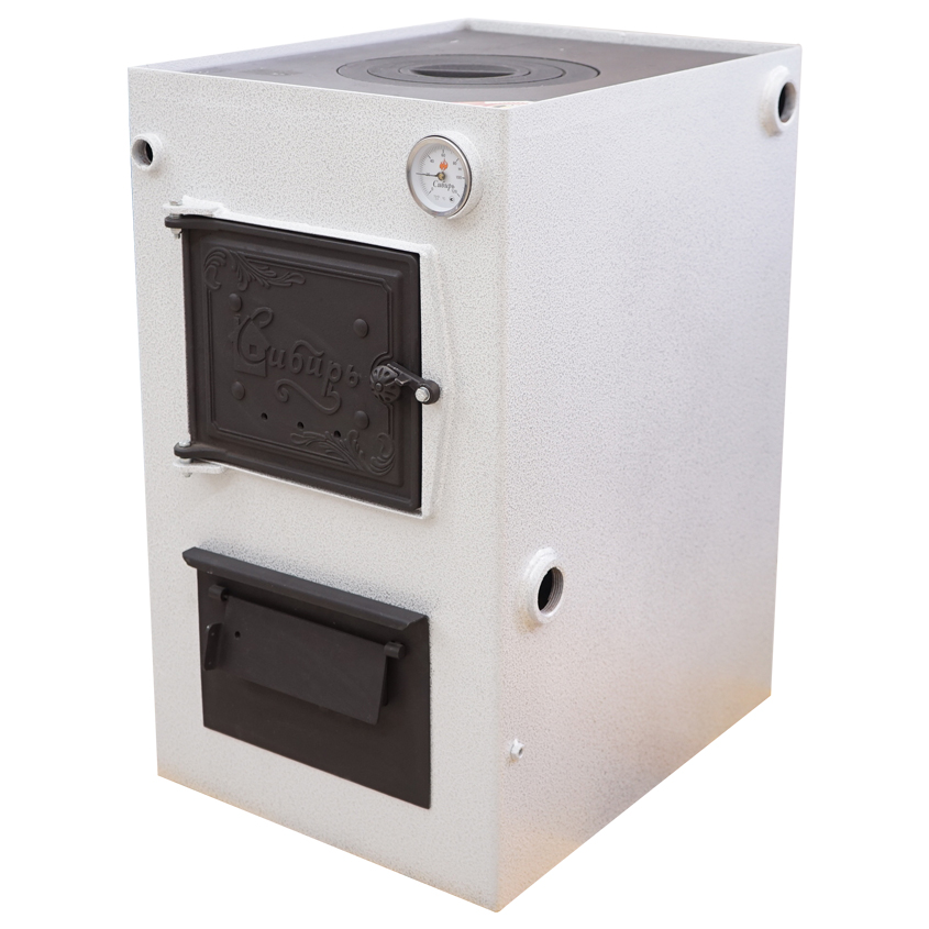 Котел Сибирь отлично подойдет для дома и дачи. Данный котел функционирует на твердом топливе: дрова, прессованные брикеты, уголь. Имеется варочная поверхность. В конструкции предусмотрена возможность установки автоматического регулятора тяги подачи воздуха и блока ТЭН. Подключение в систему отопления универсальное, выход дымохода сзади.