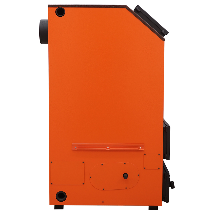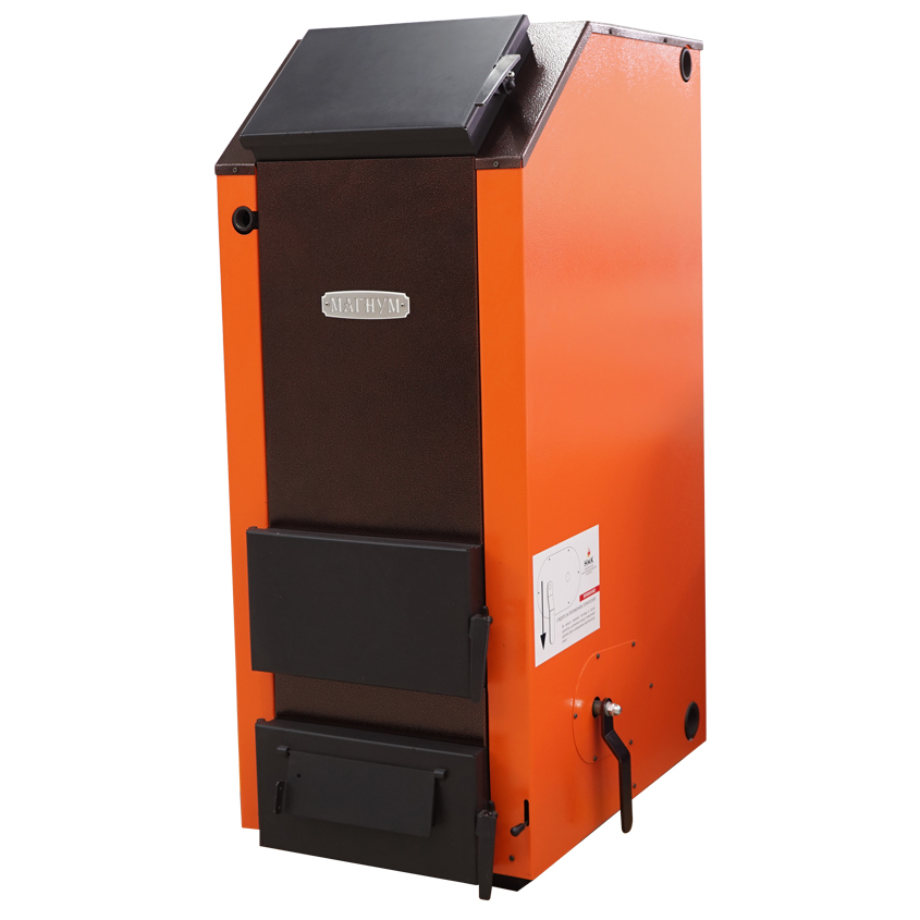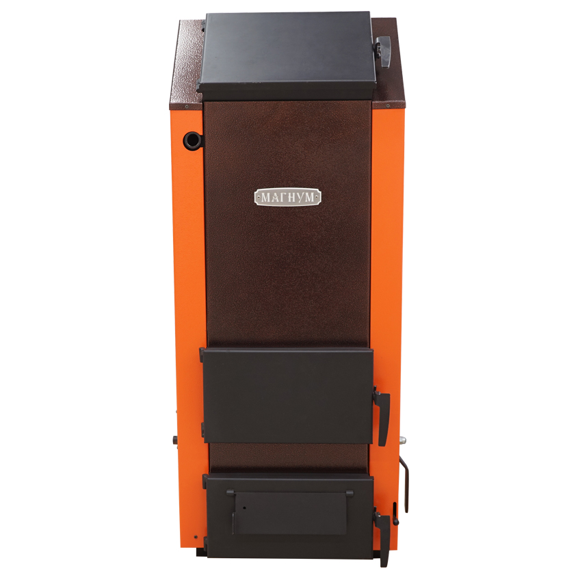Котел Магнум отлично подойдет для дома и дачи. Данный котел функционирует на угле. Использовать другие источники топлива для эффективного получения тепла, такие как дрова, прессованные брикеты и т. п. не рекомендуется, так как при этих условиях котел не выходит на свои пиковые показатели. В конструкции предусмотрена возможность установки блока ТЭН мощностью 3-6 кВт и автоматического механизма прочистки колосников. Подключение в систему отопления - универсальное, выход дымохода - сзади.