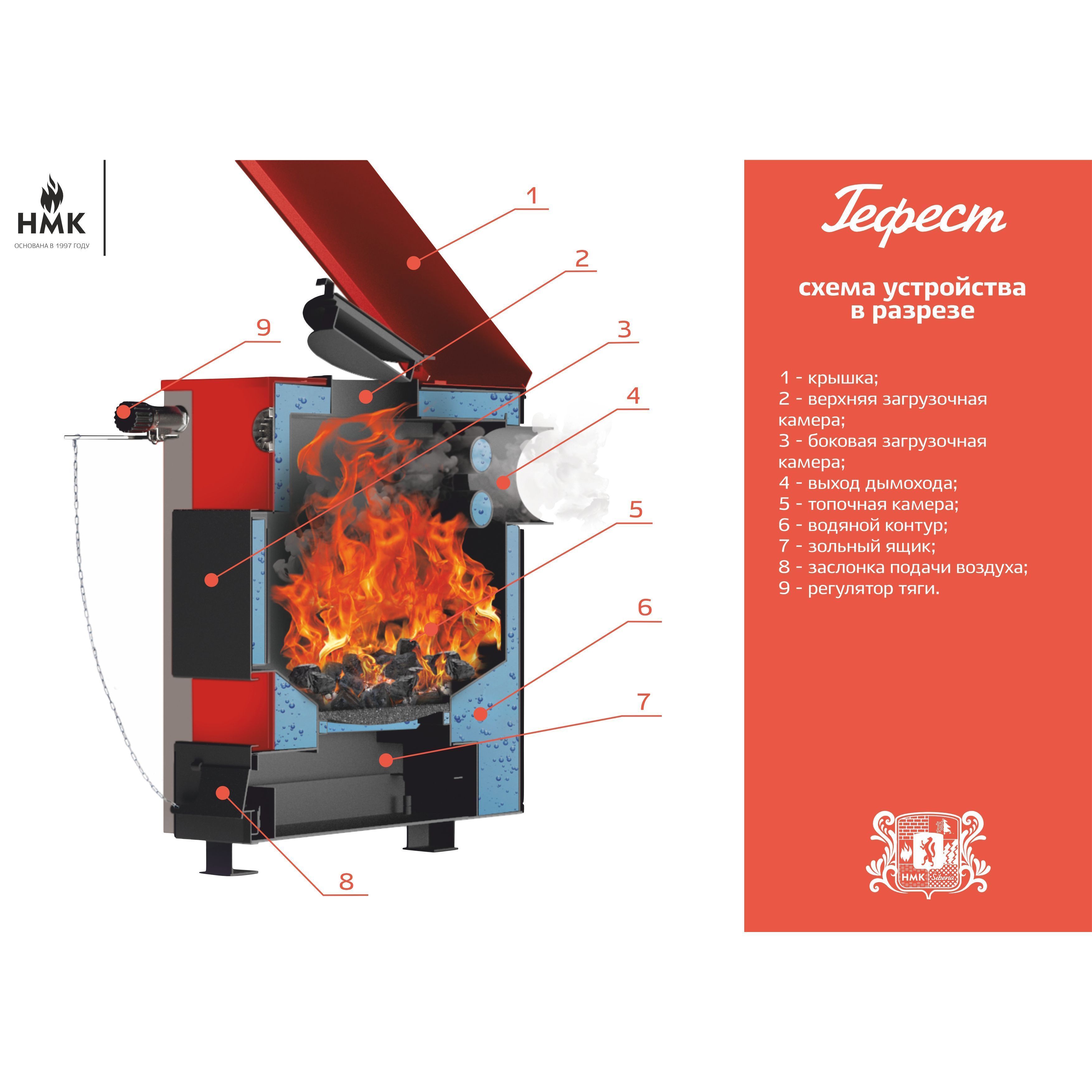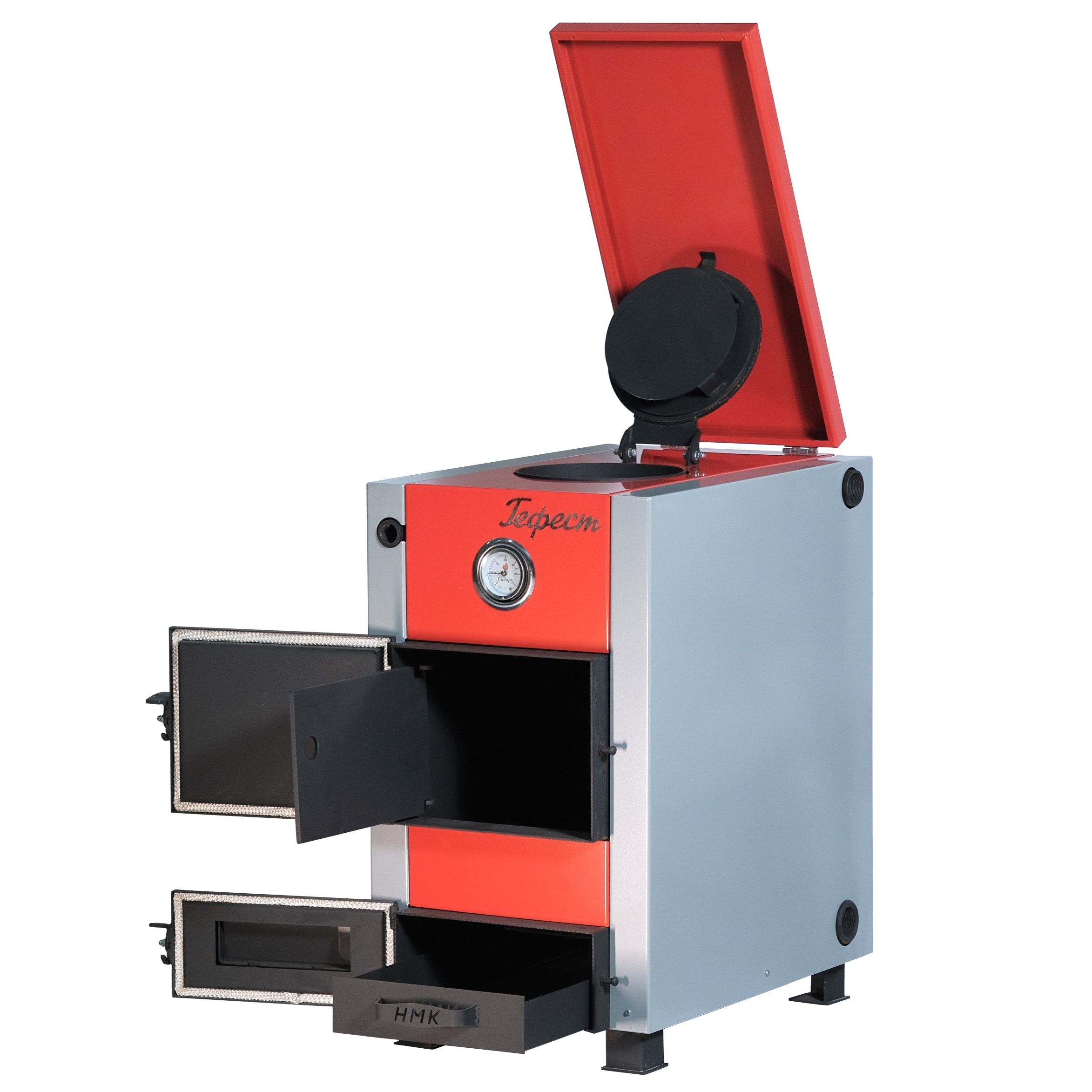 Котел Гефест отлично подойдет для дома и дачи. Данный котел функционирует на твердом топливе: дрова, уголь. В конструкции котла предусмотренна возможность установки автоматического регулятора тяги подачи воздуха и блок ТЭН мощностью 3-6 кВт. Подключение в систему отопления - универсальное, выход дымохода - сзади.
