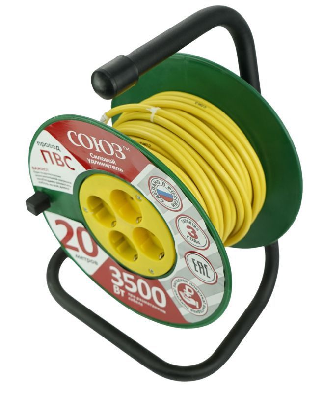 Удлинитель на катушке (СОЮЗ) 220В с заземлением, 4 розетки, ПВС 3х1мм2, 20м (481S-3502) цена - купить в Барнауле, Бийске. Размеры, характеристики, фото в интернет-магазине.