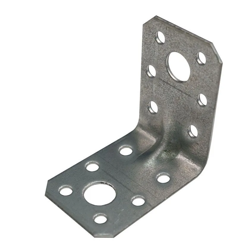 Уголок крепежный усиленный 50х50х35х2мм изготовлен из оцинкованной стали. Представляет собой пластину, согнутую под прямым углом. По центру проходит ребро жесткости. На обоих плечах (сторонах уголка) есть отверстия круглой формы: по одному отверстию большего диаметра под саморезы, болты; по несколько отверстий меньшего диаметра под гвозди, шурупы.