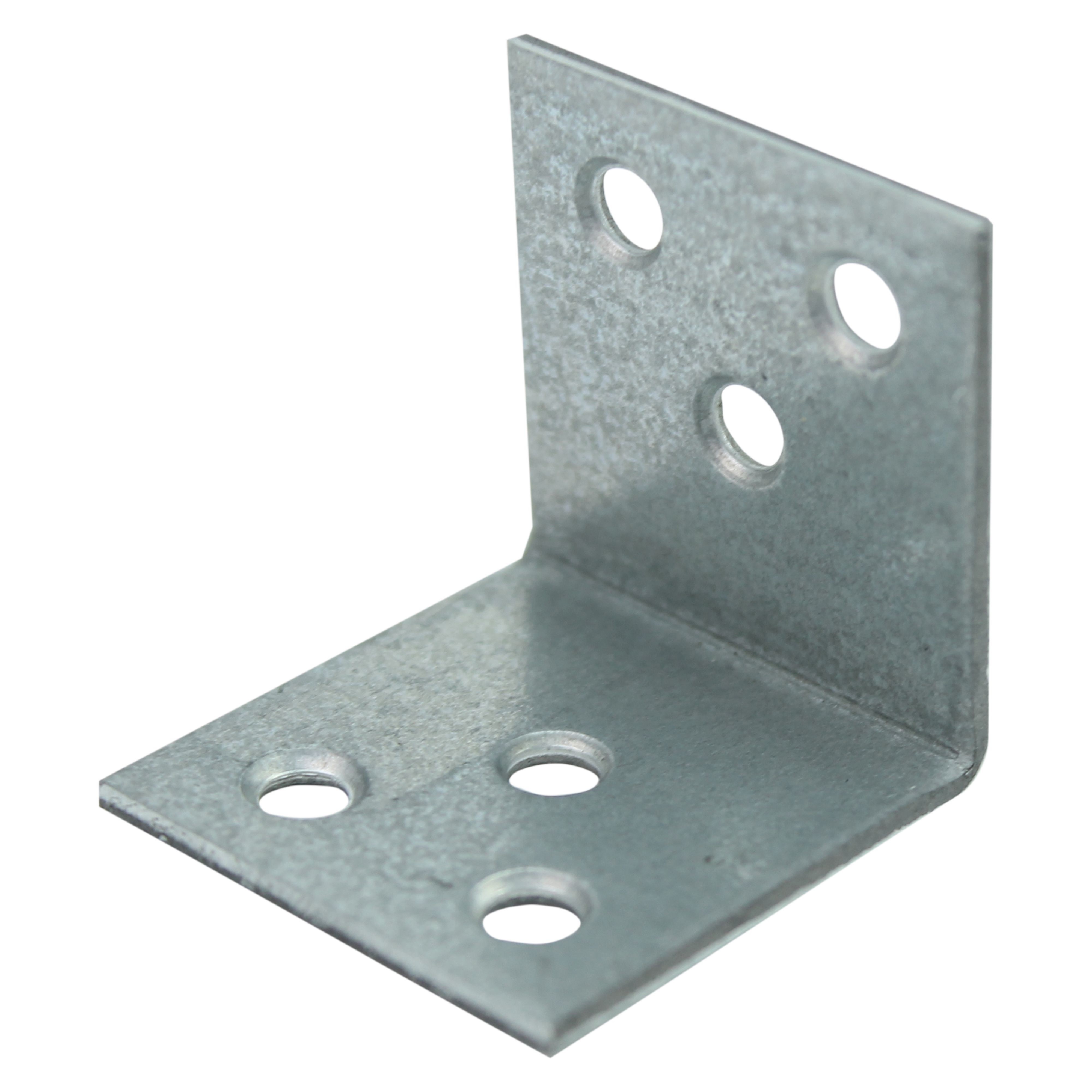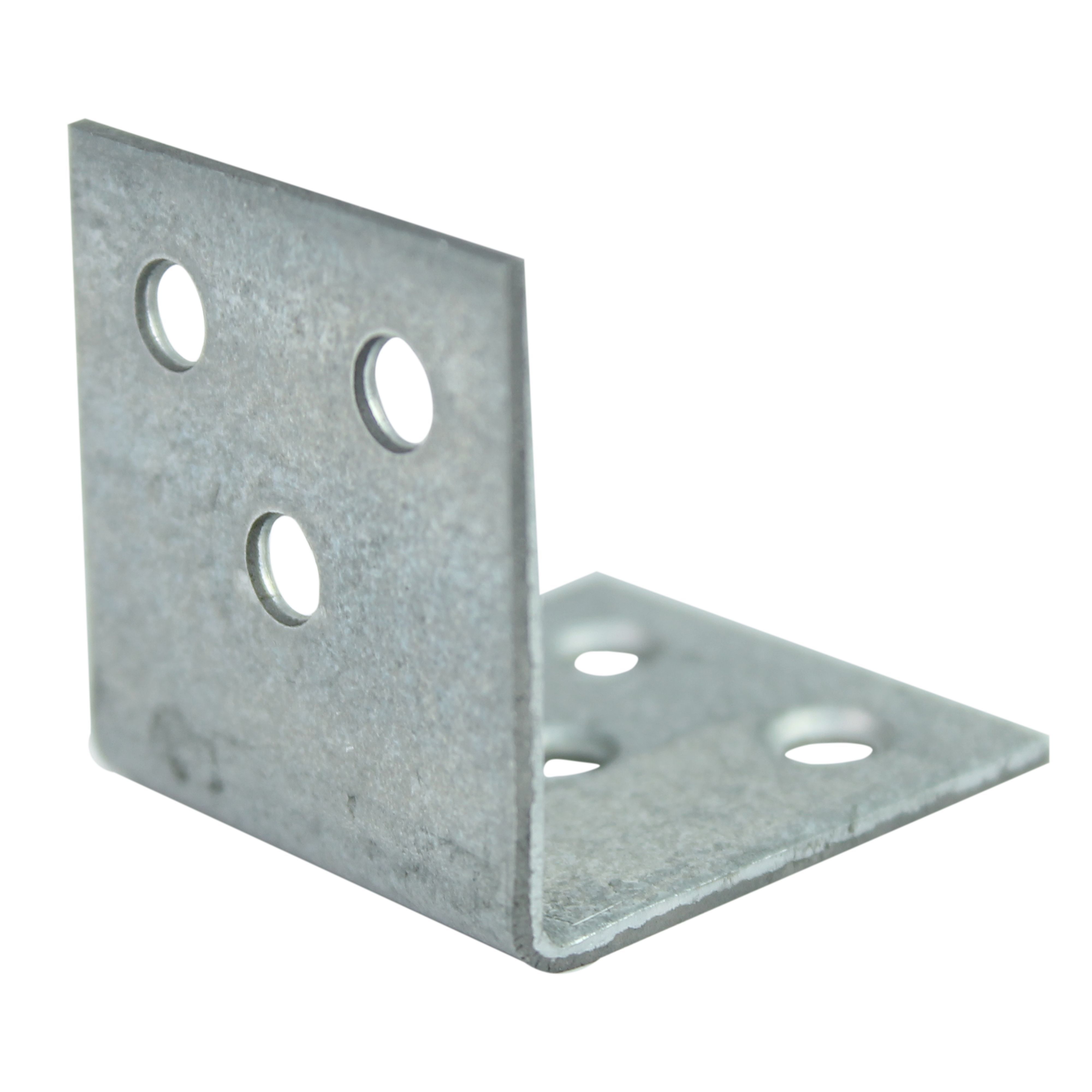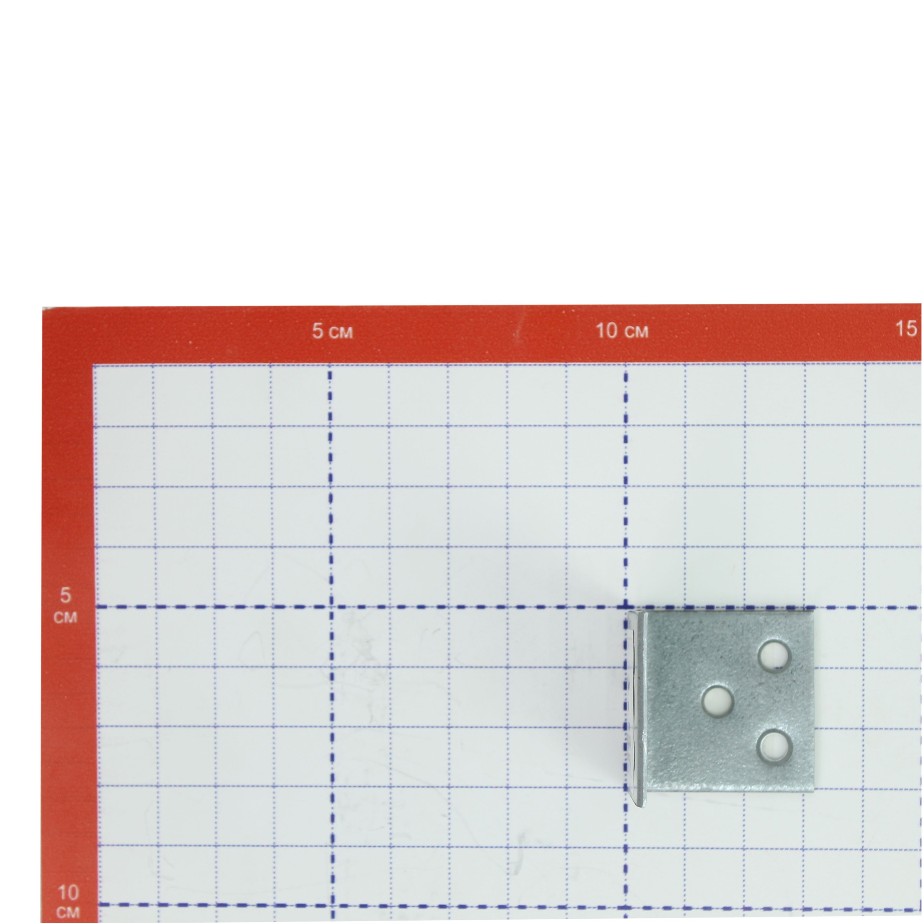 Уголок крепежный усиленный изготовлен из оцинкованной стали. Представляет собой пластину, согнутую под прямым углом. По центру проходит ребро жесткости. На обоих плечах (сторонах уголка) есть отверстия круглой формы: по одному отверстию большего диаметра под саморезы, болты; по несколько отверстий меньшего диаметра под гвозди, шурупы.