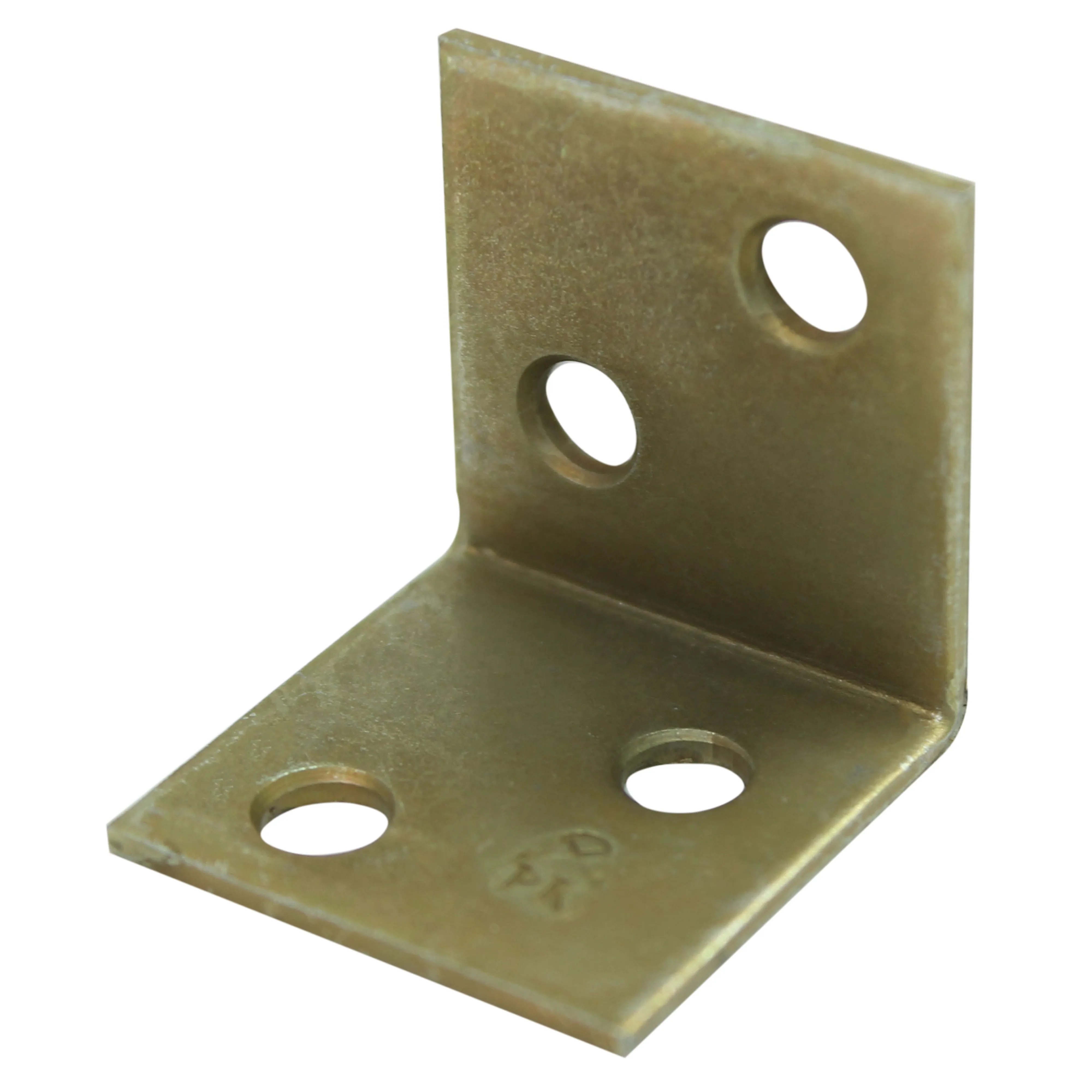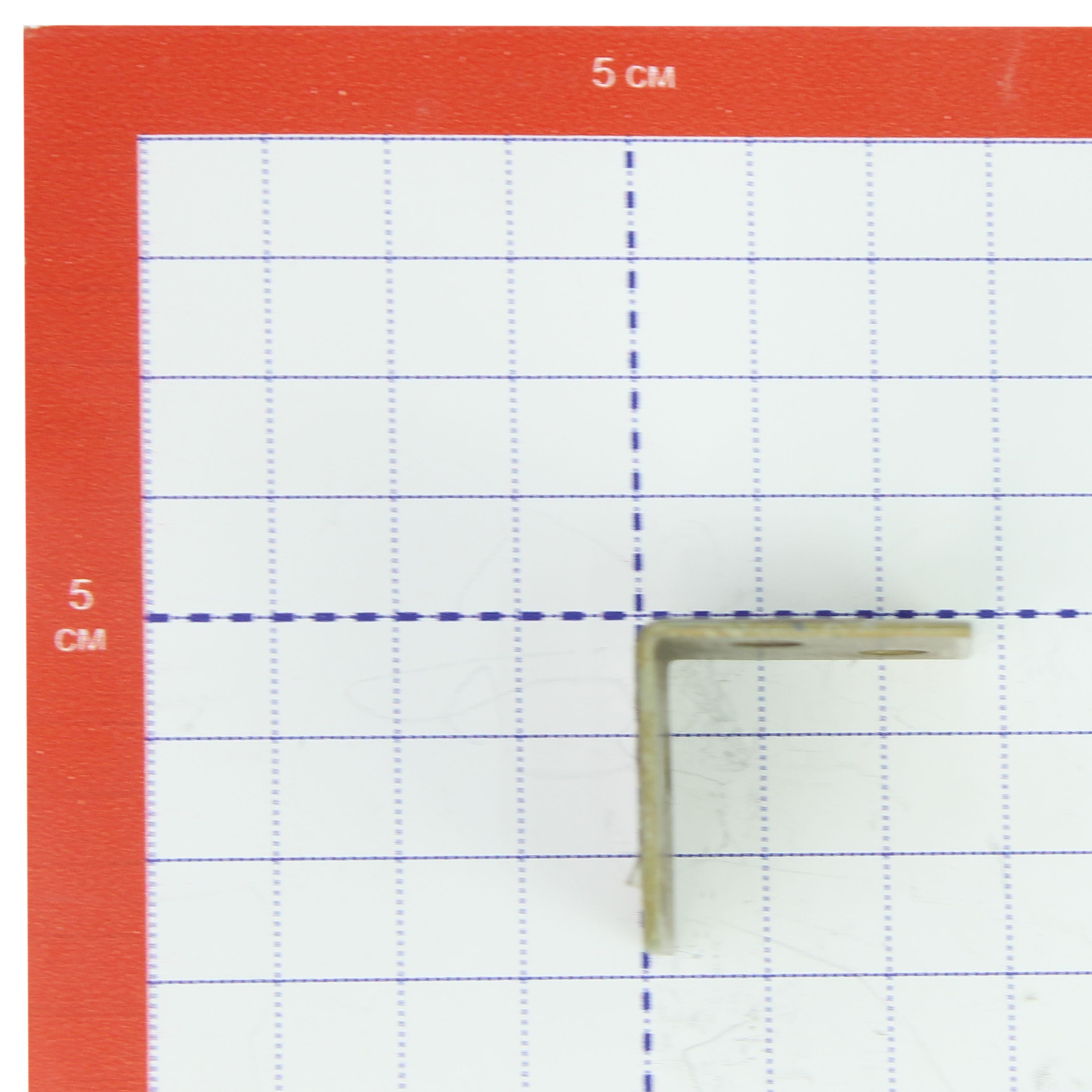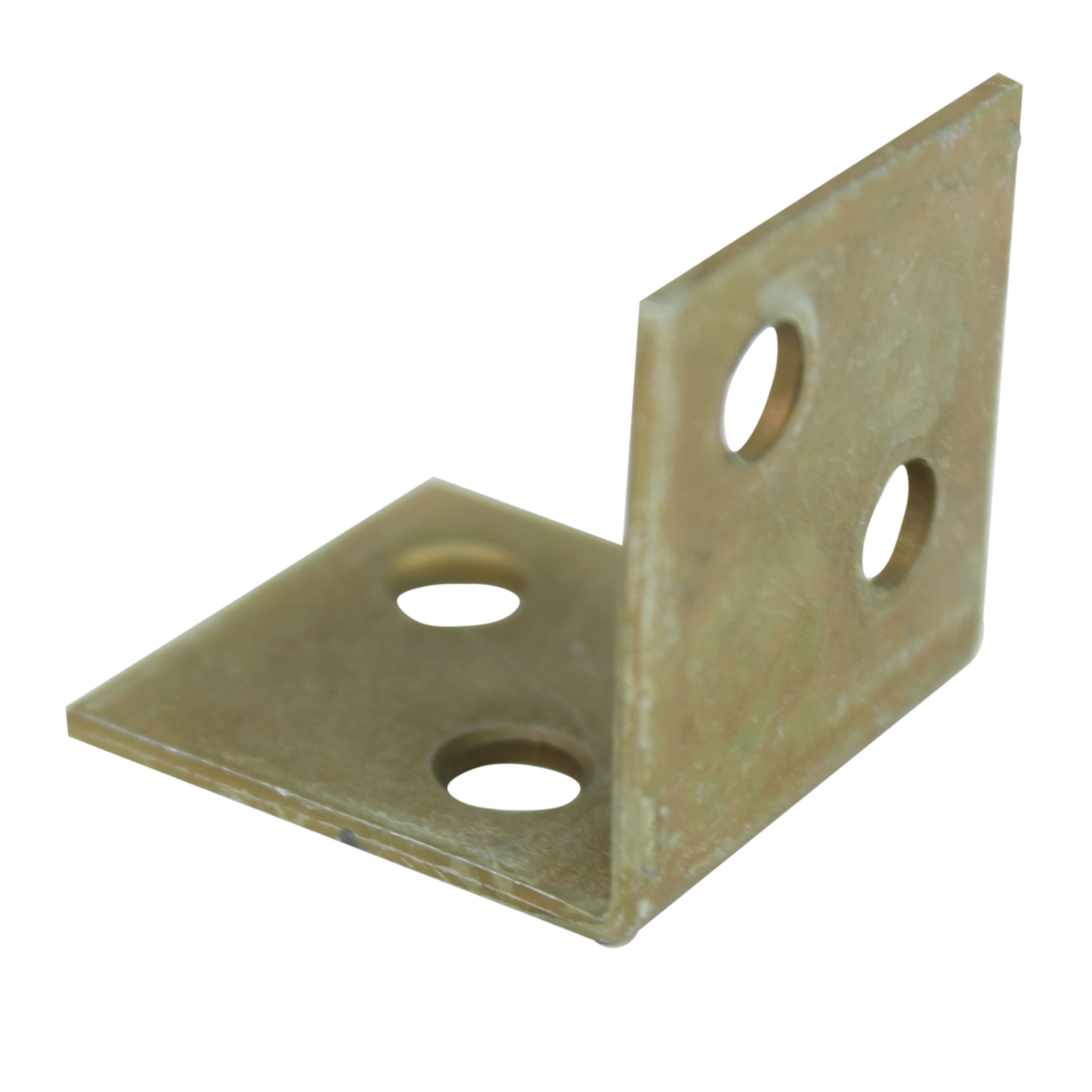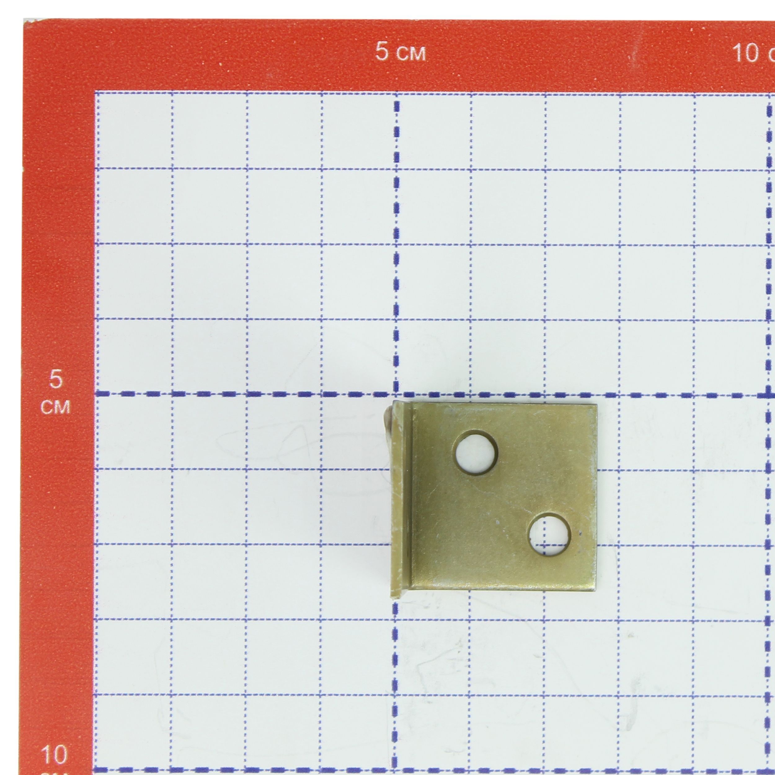 Уголок мебельный изготовлен из стали. Представляет собой пластину, согнутую под прямым углом. По центру проходит ребро жесткости. На обоих плечах (сторонах уголка) есть отверстия круглой формы для крепежа.