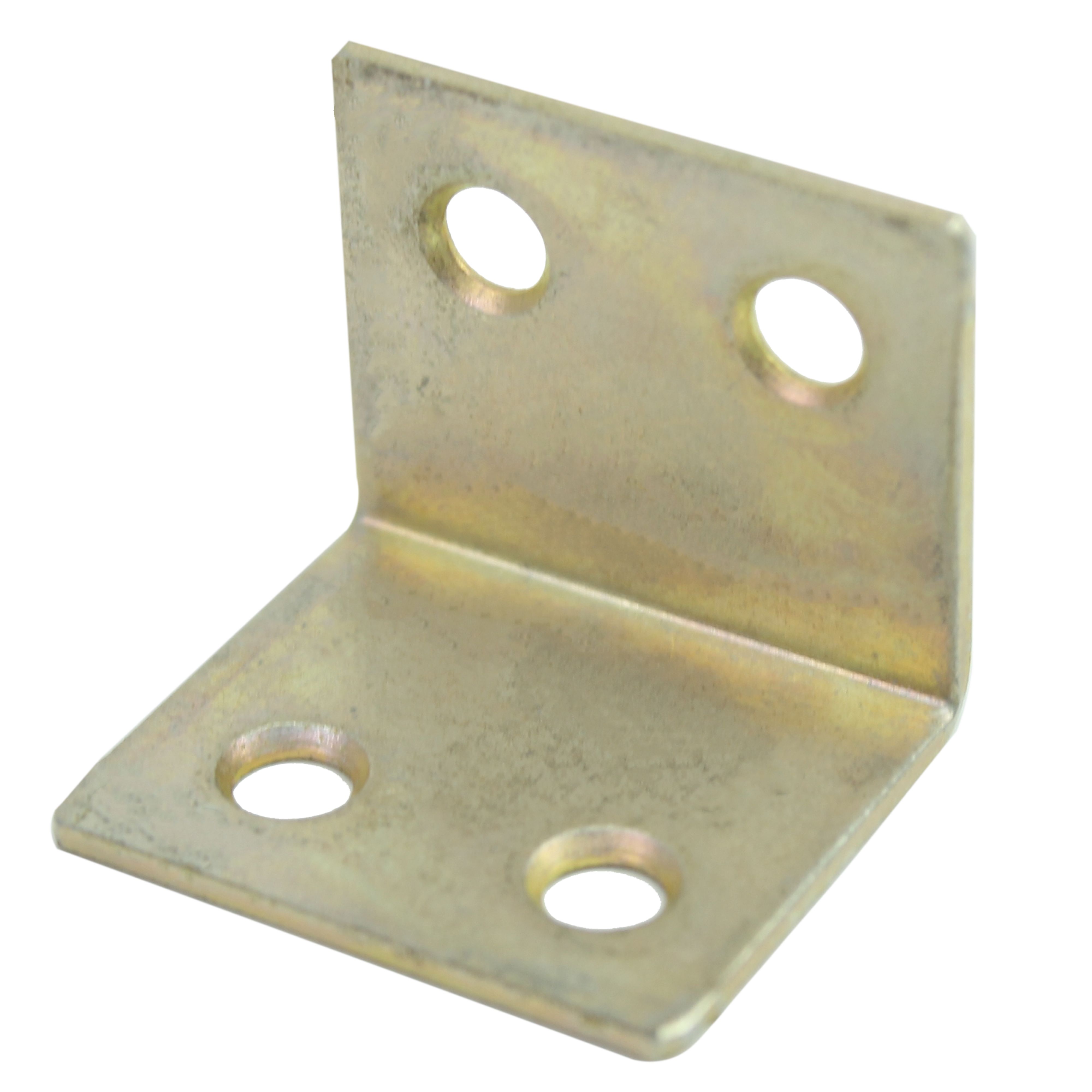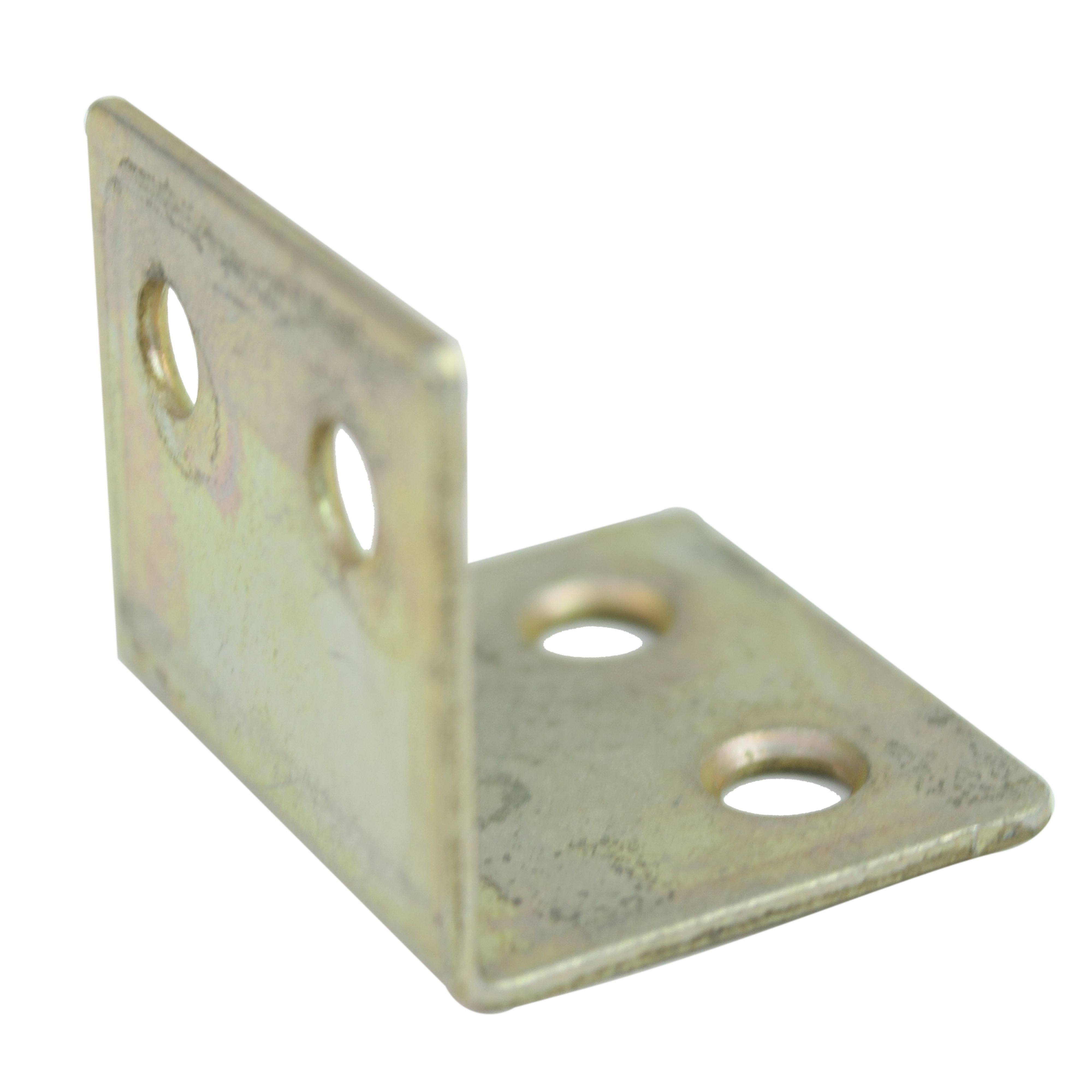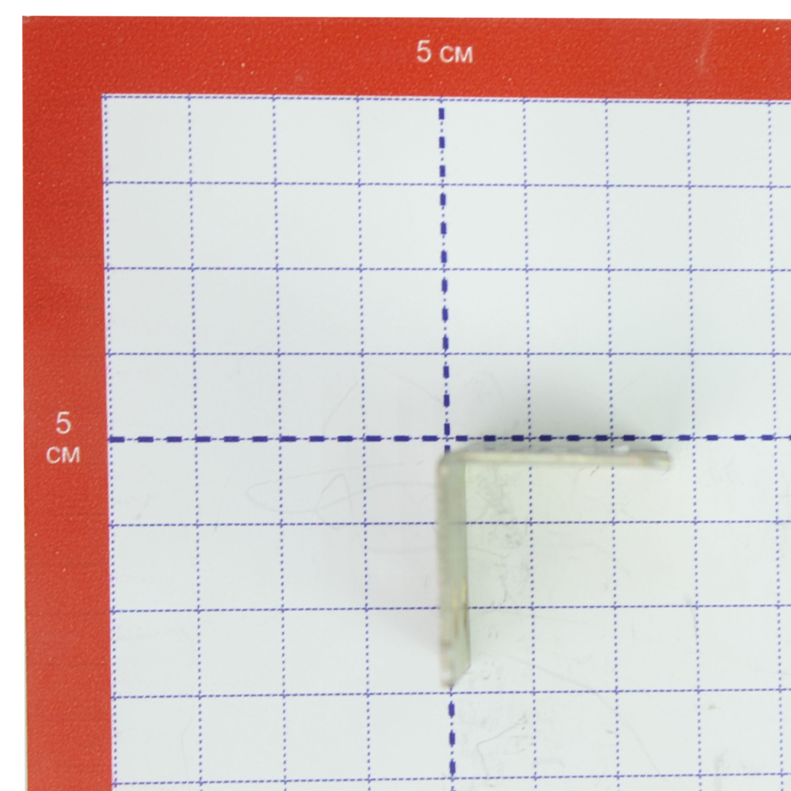 Уголок мебельный изготовлен из стали. Представляет собой пластину, согнутую под прямым углом. По центру проходит ребро жесткости. На обоих плечах (сторонах уголка) есть отверстия круглой формы для крепежа.