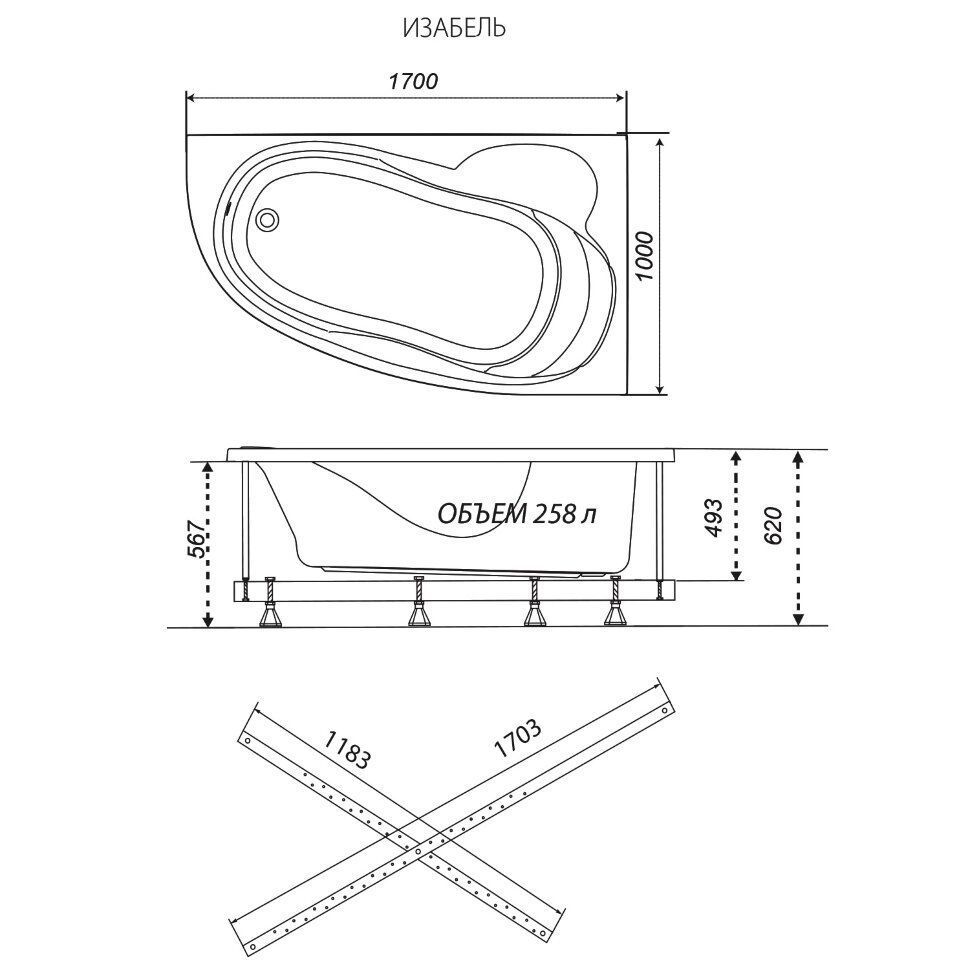 Ванна акриловая Изабель — вместительная, удобная, асимметричная, идеально вписывается как в совмещенные, так и в раздельные санузлы.